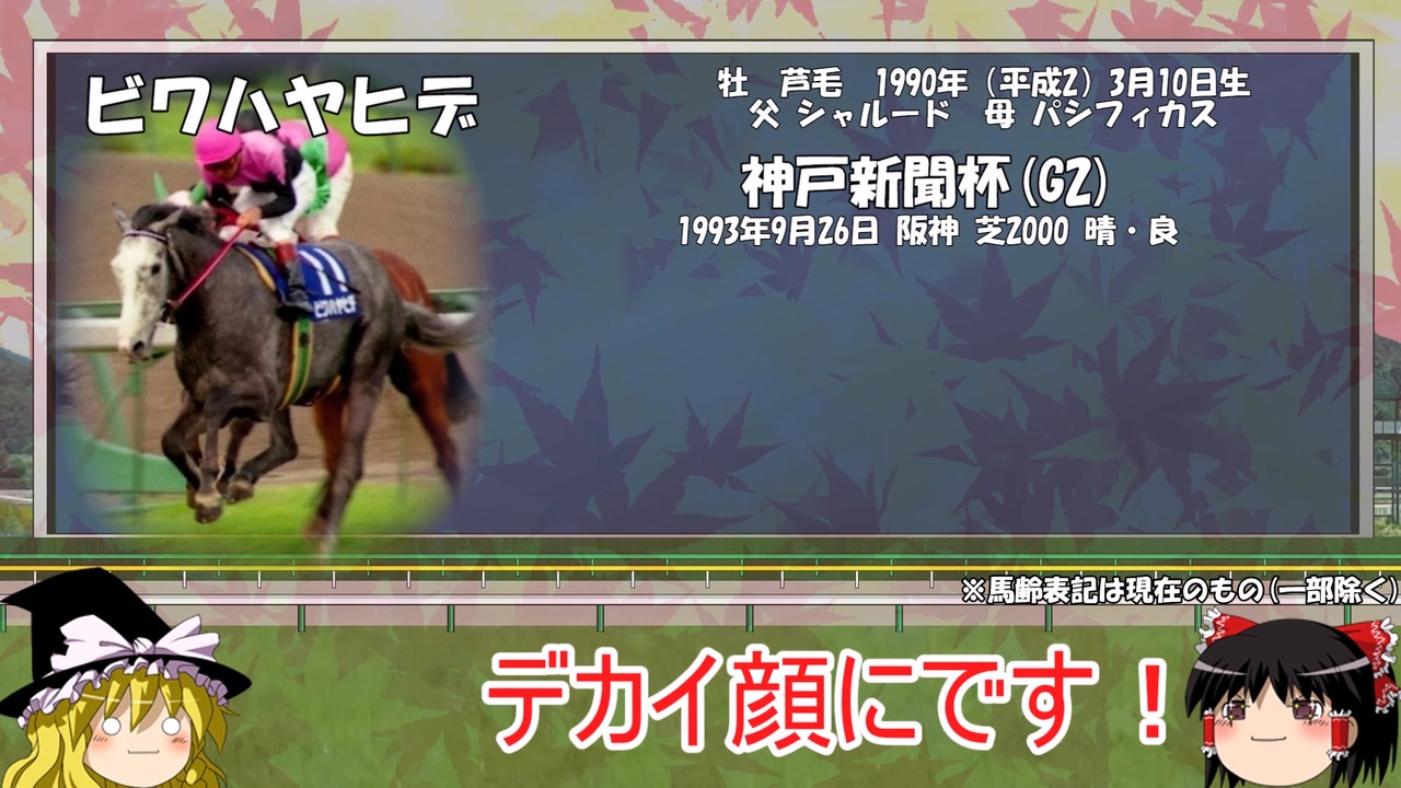 前作<a href="https://www.nicovideo.jp/watch/sm43939008" class="watch">sm43939008</a> 次 牝馬シリーズマイリス<a href="https://www.nicovideo.jp/mylist/65869255" target="_blank" rel="noopener">mylist/65869255</a> 競馬解説マイリス<a href="https://www.nicovideo.jp/mylist/64207040" target="_blank" rel="noopener">mylist/64207040</a> <br><br>つべ<a href="https://youtu.be/IGb_G8-bKQw" target="_blank" rel="noopener nofollow">https://youtu.be/IGb_G8-bKQw</a><br><br>名馬解説第45弾、ビワハヤヒデです。<br>あのナリタブライアン<a href="https://www.nicovideo.jp/watch/sm37588424" class="watch">sm37588424</a>の兄にして芦毛伝説の継承者。<br>顔がデカイ!バナナ先輩!<br><br>BGM:甘茶の音楽工房様<br>画像提供元:TURF☆DUST 様(もがみますみ様) うまぽっと様 いらすとや様 きつねゆっくり様 ニコニコモンズ様<br>参考HP:優駿達の蹄跡様 Wikipedia JBISサーチ ピクシブ百科事典 ニコニコ大百科 JRA