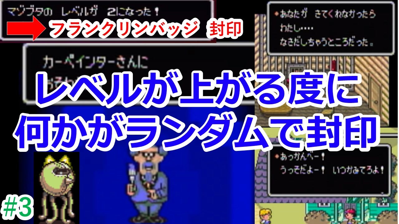 <a href="https://www.youtube.com/watch?v=VWptPHaaOwU&t=21606s" target="_blank" rel="noopener nofollow">https://www.youtube.com/watch?v=VWptPHaaOwU&t=21606s</a><br>youtubeにDQ3封印縛りのコメ付総集編をアップしました!<br>コメント弾幕で画質が下がるのを対策したいですね。<br><br>縛り内容<br>・レベルが1上がる度にランダムでPSI・道具・固有コマンド・一部のNPCが封印される。<br>・経験値が入る戦闘にて、パーティ内の最低レベルの仲間が死亡している状態での戦闘終了禁止。<br>・進路上の空間にいる敵は全て撃破。ただし、追ってこない敵は倒す必要がない。<br>・逃走禁止。<br>・ボスは試行回数殴りOK。(敗戦後、道中を飛ばして再戦可)<br><br>(封印対象物について)<br>・イベント進行不可に陥った場合の封印物使用はOK。<br> (テレポートα習得イベント時のサルへのプレゼント、ラスボス戦の「いのる」等)<br>・「こわれたアイテム」が封印されても修理可。換金のみが禁止。<br>・「テレポートαβ」「キャッシュカード」「換金不可 且つ 効果のないアイテム」は封印対象外。<br><br><br>過去シリーズ → <a href="https://www.nicovideo.jp/mylist/71307387" target="_blank" rel="noopener">mylist/71307387</a><br>告知 → <a href="https://twitter.com/mazoriahosh" target="_blank" rel="noopener nofollow">https://twitter.com/mazoriahosh</a><br>youtube → <a href="https://www.youtube.com/watch?v=qskHDlLNypY" target="_blank" rel="noopener nofollow">https://www.youtube.com/watch?v=qskHDlLNypY</a>
