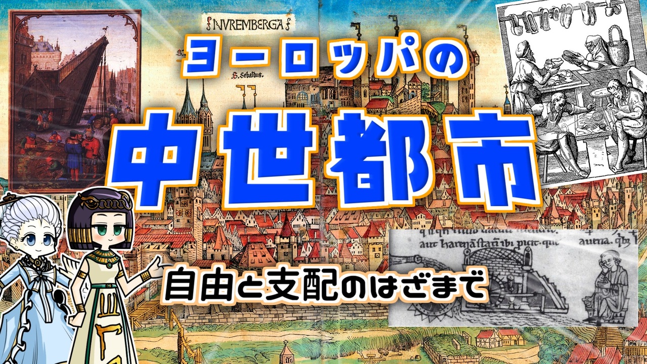 マリーとパトラはトシについてお話するようです。 <br><br>都市の空気は人を自由にする━━ RPGとかでもアニメでも、大きな都市を見るとワクワクしますよね。でも都市ってそもそもどういう存在じゃ? そんなことをつらつらと話していく回です。 <br><br>今回の参考文献: <br>ハインリヒ・プレティヒャ(2023)『中世への旅 都市と庶民』関楠生訳 白水社<br>C.メグゼーパー/E.シュトラウト共編(1995)『ドイツ中世の日常生活』瀬原義生監訳 刀水書房<br>河原温(1996)『中世ヨーロッパの都市世界』山川出版<br>堀越宏一(1997)『中世ヨーロッパの農村世界』山川出版社<br>エルンスト・シューベルト(2005)『名もなき中世人の日常』藤代幸一訳 八坂書房<br>アンリ・ピレンヌ(2018)『中世都市』佐々木克巳訳 講談社<br>高橋理(2013)『ハンザ「同盟」の歴史』創元社<br><br>その他 Wikipediaなど<br><br>twitter→<a href="https://twitter.com/mond_historica" target="_blank" rel="noopener nofollow">https://twitter.com/mond_historica</a><br />━━━━━━━━━━━━━━━━━━━━━<br><br>この動画はクリエイティブ・コモンズ継承(CC-BY-SA)ライセンスの素材を使用して制作しています。(<a href="https://creativecommons.org/licenses/by-sa/4.0/)" target="_blank" rel="noopener nofollow">https://creativecommons.org/licenses/by-sa/4.0/)</a><br>規約に基づき、この動画もCC-BY-SA 4.0 のもとで公開します。<br><br>投稿者共通情報☆彡<br><br>BGM, SE:ニコニ・コモンズ様<br><a href="http://commons.nicovideo.jp/" target="_blank" rel="noopener nofollow">http://commons.nicovideo.jp/</a><br>魔王魂様<br><a href="https://maoudamashii.jokersounds.com/" target="_blank" rel="noopener nofollow">https://maoudamashii.jokersounds.com/</a><br>Audiostock様<br><a href="https://audiostock.jp/" target="_blank" rel="noopener nofollow">https://audiostock.jp/</a><br><br>立ち絵 霊夢・魔理沙(黒子式):nicotalk様<br><a href="http://www.nicotalk.com/charasozai.html" target="_blank" rel="noopener nofollow">http://www.nicotalk.com/charasozai.html</a><br><br>立ち絵 パトラ、マリー、アン、メアリ:ライフライフ様<br><a href="https://0801lifelife.tumblr.com/" target="_blank" rel="noopener nofollow">https://0801lifelife.tumblr.com/</a><br><br>使用ツール1:ゆっくりムービーメーカー4<br><a href="https://manjubox.net/ymm4/" target="_blank" rel="noopener nofollow">https://manjubox.net/ymm4/</a><br><br>使用ツール2:AviUtl<br><a href="http://spring-fragrance.mints.ne.jp/aviutl/" target="_blank" rel="noopener nofollow">http://spring-fragrance.mints.ne.jp/aviutl/</a><br><br>各時代の地図 : World History Maps & Timelines <br><a href="http://geacron.com/home-en/" target="_blank" rel="noopener nofollow">http://geacron.com/home-en/</a><br><br>ゆっくりボイスについて:AquesTalkライセンス取得済み<br><br>キャラクターボイス<br>アン・ボニー:羽ノ華(A.I.VOICE)<br>メアリ・リード:琴葉 葵(A.I.VOICE)<br>クレオパトラ:結月ゆかり(VOICEROID2)<br>マリー‐アントワネット:東北きりたん (VOICEROID EX)<br>その他キャラ:青山龍星(A.I.VOICE)、伊織弓鶴(A.I.VOICE2)、栗田まろん(A.I.VOICE)、宮舞モカ(VOICEPEAK)、フリモメン(VOICEPEAK)<br><br><br><br>その他フリー素材ご提供元の皆様に圧倒的感謝<br>