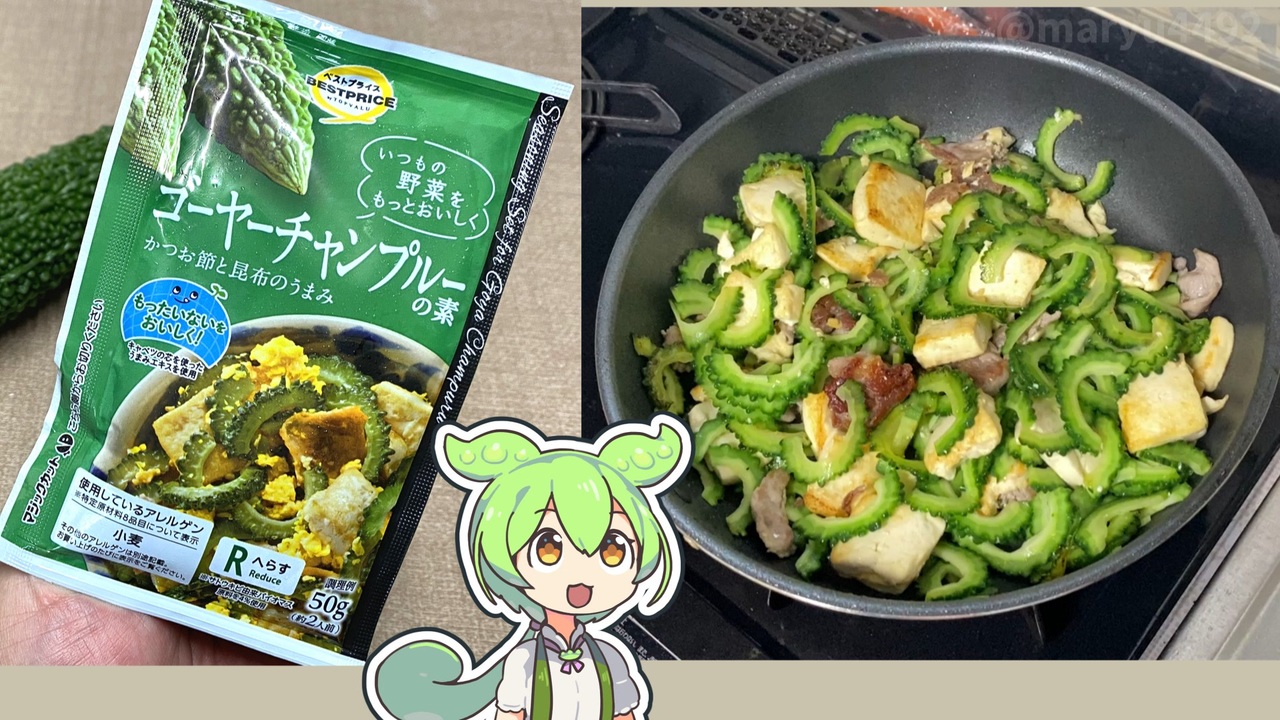 野菜売り場にゴーヤが置いてあり、その横にこの小袋が置いてありました。 <br><br><br><br> 【参考】<br> ゴーヤーチャンプルーの素(トップバリュ)<br> <a href="https://www.topvalu.net/items/detail/4549414623840/" target="_blank" rel="noopener nofollow">https://www.topvalu.net/items/detail/4549414623840/</a> <br>鍋・フライパン(トップバリュ)<br> <a href="https://www.topvalu.net/items/list/950400100/" target="_blank" rel="noopener nofollow">https://www.topvalu.net/items/list/950400100/</a> <br>鉄板玉子チャーハン(丸源ラーメン)<br> <a href="https://www.syodai-marugen.jp/menu/side/" target="_blank" rel="noopener nofollow">https://www.syodai-marugen.jp/menu/side/</a><br><br><br> 【使用した素材】(※敬称略) <br>(合成音声)VOICEVOX/ずんだもん/四国めたん <br><a href="https://voicevox.hiroshiba.jp/" target="_blank" rel="noopener nofollow">https://voicevox.hiroshiba.jp/</a> <br>(立ち絵)坂本アヒル<br> <a href="https://seiga.nicovideo.jp/seiga/im10788496" target="_blank" rel="noopener">im10788496</a>/<a href="https://seiga.nicovideo.jp/seiga/im10791276" target="_blank" rel="noopener">im10791276</a> <br>(楽曲)甘茶の音楽工房/「楽しい麦畑」「フルーツパフェ」「お城の舞踏会」 <br><a href="https://amachamusic.chagasi.co" target="_blank" rel="noopener nofollow">https://amachamusic.chagasi.co</a>