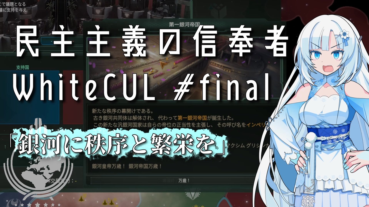 <span style="font-size: 24px;"><strong><i>”究極の平和がこの銀河に訪れる日がとうとう来たのです”</i></strong></span><br>このシリーズも皆様のおかげで完結なので初投稿です<br>Paradox Interactiveの宇宙4Xゲーム、stellarisのRP風VOICEVOX実況プレイです<br>襲い来る終盤の危機と戦い、新秩序を銀河に齎すニューアース連邦をお楽しみください<br><br><span style="color: #ff0000; font-size: 18px;"><strong>ストアページ</strong></span><span style="font-size: 18px;"><strong>→<a href="https://store.steampowered.com/app/281990/Stellaris/" target="_blank" rel="noopener nofollow">https://store.steampowered.com/app/281990/Stellaris/</a></strong></span><br><br><a href="https://www.nicovideo.jp/watch/sm43990847" class="watch">sm43990847</a>←前 スペースマリーンが好きな方はこちらもどうぞ→<a href="https://www.nicovideo.jp/watch/sm44158313" class="watch">sm44158313</a><br>パート1はこちら→<a href="https://www.nicovideo.jp/watch/sm43595798" class="watch">sm43595798</a><br><br>ロボコップが好きな方はこちらもどうぞ→<a href="https://www.nicovideo.jp/series/439554" target="_blank" rel="noopener">series/439554</a><br>管理民主主義が好きな方はこちらもどうぞ→<a href="https://www.nicovideo.jp/series/461985" target="_blank" rel="noopener">series/461985</a><br>植民地海兵隊が好きな方はこちらもどうぞ→<a href="https://www.nicovideo.jp/series/414648" target="_blank" rel="noopener">series/414648</a><br>機動歩兵が好きな方はこちらもどうぞ→<a href="https://www.nicovideo.jp/series/411156" target="_blank" rel="noopener">series/411156</a><br><br>VOICEVOX:WhiteCUL、青山龍星、四国めたん、後鬼、白上虎太郎、冥鳴ひまり<br>COEIROINK:松嘩りすく、クロワちゃん<br><br><a target="_blank" href="https://qa.nicovideo.jp/faq/show/19424?site_domain=default" style="font-size: 13px;color: #657586; text-decoration: underline; line-height: 1.4">この動画は投稿者によって修正されました</a>