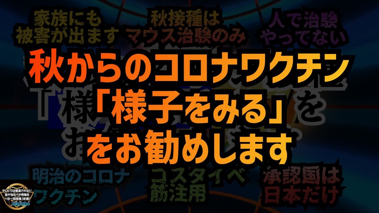 全国有志医師の会では新型コロナワクチンを信じて打ち続けてきた方々にむけて、秋からの接種を控えていただくチラシを作成しました。<br>ご高齢の方が見やすいように、大きなフォントになっています。<br>ぜひご利用ください。<br><br>全国有志医師の会 vmed.jp/7236/<br><br><a href="https://x.com/Papa_Cocoa_Milk/status/1830006917902802945?t=c_B8akA7Fek3I0ThJiWdBQ&s=19" target="_blank" rel="noopener nofollow">https://x.com/Papa_Cocoa_Milk/status/1830006917902802945?t=c_B8akA7Fek3I0ThJiWdBQ&s=19</a><br><br>追加・修正版<br><a href="https://x.com/vmed_Japan/status/1830065405261762582?t=s3sp60Acbo_s0v-UtxAJlA&s=19" target="_blank" rel="noopener nofollow">https://x.com/vmed_Japan/status/1830065405261762582?t=s3sp60Acbo_s0v-UtxAJlA&s=19</a><br><br>シェディングは世界的に認められた遺伝子製剤のリスク<br><a href="https://x.com/moonlig74730283/status/1813875020671975893?t=kY_mPuh0MltvaQ4tmuiJWQ&s=19" target="_blank" rel="noopener nofollow">https://x.com/moonlig74730283/status/1813875020671975893?t=kY_mPuh0MltvaQ4tmuiJWQ&s=19</a><br><br><br>秋のワクチン接種 ワクチン 新型コロナウイルス シェディング レプリコンワクチン コスタイベ筋注用<br><br>秋接種のレプリコンはマウス治験のみ<br>秋接種のレプリコンはヒトでの治験やってない<br>秋接種のレプリコンはまだ未承認<br>秋接種のコロナワクチンは様子を見る<br>全国有志医師の会<br><br><br><br />著作権、肖像権に配慮して作成しております。<br><br>◆気になったニュースの台本!?<br>メモ代わりに作った台本をそのままあげてます<br><a href="https://keiichiro8140.hatenablog.com/." target="_blank" rel="noopener nofollow">https://keiichiro8140.hatenablog.com/.</a><br><br><br>ここからはシリーズ紹介<br><br><br>◆ ワクチン解毒・デトックス<br><a href="https://x.gd/fZweg" target="_blank" rel="noopener nofollow">https://x.gd/fZweg</a><br><br>◆ウイリアム・マキス博士のがん治療(イベルメクチン・フェンベンダゾール等)<br><a href="https://x.gd/AtFYS" target="_blank" rel="noopener nofollow">https://x.gd/AtFYS</a><br><br>◆予防接種健康被害救済制度<br><a href="https://x.gd/0xK9x" target="_blank" rel="noopener nofollow">https://x.gd/0xK9x</a><br><br>◆気になったニュース #1501~<br><br>◆ 【ショートver】気になったニュース<br><a href="https://x.gd/7MxXC" target="_blank" rel="noopener nofollow">https://x.gd/7MxXC</a><br><br>◆ 気になったニュース #1001~<br><a href="https://x.gd/Lp8gv" target="_blank" rel="noopener nofollow">https://x.gd/Lp8gv</a><br><br>◆ 気になったニュース #501~<br><a href="https://x.gd/EmbS4" target="_blank" rel="noopener nofollow">https://x.gd/EmbS4</a><br><br>◆ 気になったニュース #1~#500<br><a href="https://x.gd/uPhNb" target="_blank" rel="noopener nofollow">https://x.gd/uPhNb</a><br><br>◆ X(旧Twitter)・テレグラムで気になった情報<br><a href="https://x.gd/YG6FT" target="_blank" rel="noopener nofollow">https://x.gd/YG6FT</a><br><br>◆ 日比谷5万人パレードデ⚪生放送アーカイブ動画<br><a href="https://x.gd/3CHJv" target="_blank" rel="noopener nofollow">https://x.gd/3CHJv</a><br><br>◆日比谷5万人パレード⚪モのマイリスト作ってみました<br><a href="https://nico.ms/mylist/76828848?ref=sp_other" target="_blank" rel="noopener nofollow">https://nico.ms/mylist/76828848?ref=sp_other</a><br><br>◆3.30 令和の百姓⚪⚪<br><a href="https://www.nicovideo.jp/series/511791?ref=garage_share_other" target="_blank" rel="noopener nofollow">https://www.nicovideo.jp/series/511791?ref=garage_share_other</a><br><br>◆ 及川幸久さんの【XNEWS】シリーズ<br><a href="https://x.gd/3k78K" target="_blank" rel="noopener nofollow">https://x.gd/3k78K</a><br><br>◆これまでの動画<a href="https://x.gd/sPXoJ" target="_blank" rel="noopener nofollow">https://x.gd/sPXoJ</a><br><br>◆もしも(BAN)の時のためのマイリンク集<a href="https://lit.link/K-16_News44" target="_blank" rel="noopener nofollow">https://lit.link/K-16_News44</a><br><br>