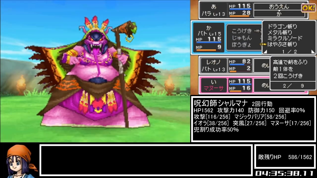 ドラクエ9の通常RTA<br>計測区間は電源投入からto be continued消失まで<br>外部通信及び乱数調整は基本禁止<br><br>いつも沼ることでおなじみのシャルマナ戦だが…<br><br>Twitch→<a href="https://www.twitch.tv/eru_swd" target="_blank" rel="noopener nofollow">https://www.twitch.tv/eru_swd</a><br><br>part1→<a href="https://www.nicovideo.jp/watch/sm44029624" class="watch">sm44029624</a><br>次→シリーズからよろしく、概要欄の一番下にあるよ<br>これのマイリス→<a href="https://www.nicovideo.jp/mylist/77008655" target="_blank" rel="noopener">mylist/77008655</a><br>無編集垂れ流し→<a href="https://youtu.be/ZwwoluWdXqc" target="_blank" rel="noopener nofollow">https://youtu.be/ZwwoluWdXqc</a><br>うp動画まとめ→<a href="https://www.nicovideo.jp/mylist/71230916" target="_blank" rel="noopener">mylist/71230916</a><br>Bテーブル詳細まとめ→<a href="https://springwilddance.hatenablog.com/entry/2023/04/29/162728" target="_blank" rel="noopener nofollow">https://springwilddance.hatenablog.com/entry/2023/04/29/162728</a><br><br>計測開始~ぬしさままで<br><br>※この動画の一部または全部を外部サイト等へ転載することを禁じます。<br> 動画紹介等で動画の一部を引用するのは構いません。<br><br>この動画で利用している株式会社スクウェア・エニックスを代表とする共同著作者が権利を所有する著作物及びスギヤマ工房有限会社が権利を所有する楽曲の転載・配布は禁止いたします。<br>© 2009 ARMOR PROJECT/BIRD STUDIO/LEVEL-5/SQUARE ENIX All Rights Reserved.<br>© SUGIYAMA KOBO<br>Ⓟ SUGIYAMA KOBO