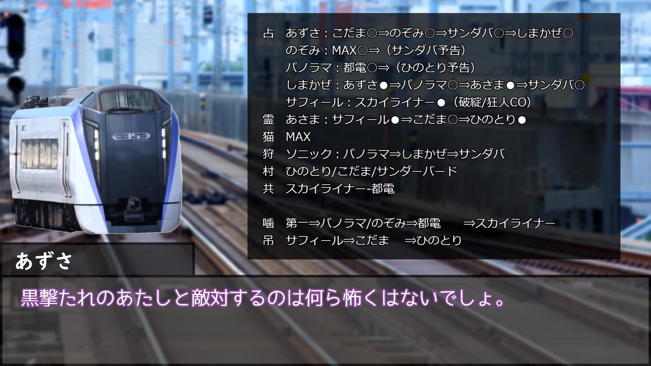 ゼェハァ…どうにか終わったぞ…<br><br>14C猫FO:村1/占2/霊1/狩1/猫1/共2/狼3/狂2/狐1<br><br>2日目:<a href="https://www.nicovideo.jp/watch/sm43874250" class="watch">sm43874250</a><br>4日目:<a href="https://www.nicovideo.jp/watch/sm44023431" class="watch">sm44023431</a> 反省会:<a href="https://www.nicovideo.jp/watch/sm44114257" class="watch">sm44114257</a><br><br>Twitterで考察して頂ける方は『#電車で人狼』を入れて呟いていただけると探しやすいです。<br>擬人化関連のFAは『#鉄擬で人狼』を入れて頂けると助かります。<br>(既に投稿されたものはそのままで大丈夫ですよ!)<br><br>電車で人狼!マイリスト <a href="https://www.nicovideo.jp/mylist/72946958" target="_blank" rel="noopener">mylist/72946958</a><br>電車で人狼! 支線編(解説動画) <a href="https://www.nicovideo.jp/mylist/79077747" target="_blank" rel="noopener">mylist/79077747</a><br>人狼動物園マイリスト <a href="https://www.nicovideo.jp/mylist/72986089" target="_blank" rel="noopener">mylist/72986089</a><br><br><a target="_blank" href="https://qa.nicovideo.jp/faq/show/19424?site_domain=default" style="font-size: 13px;color: #657586; text-decoration: underline; line-height: 1.4">この動画は投稿者によって修正されました</a>