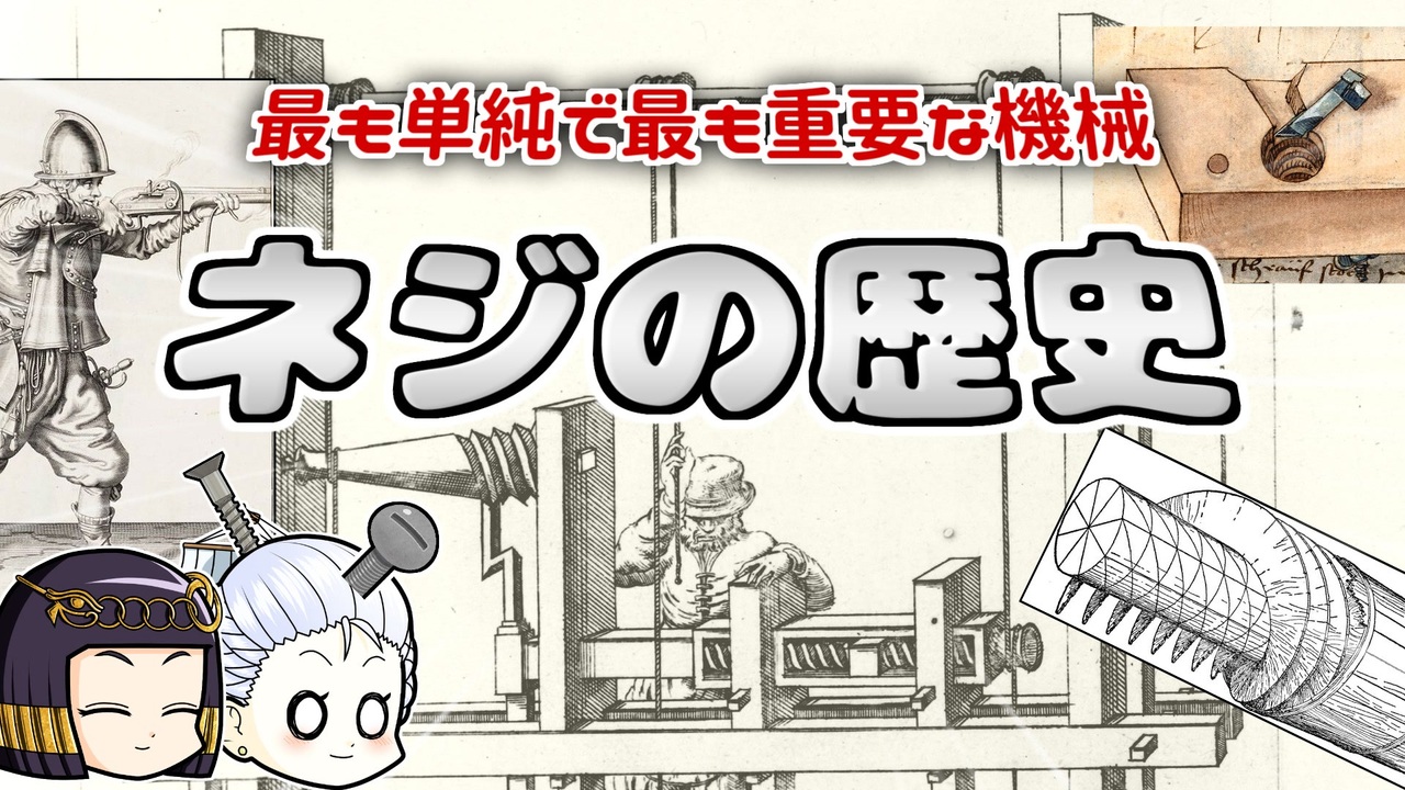 マリーはまた甘い考えを持っているようです。 <br><br>スクリュードライバーっていうとなんか強力な技のような気がしますが、ネジ回しのことです。 <br>でも、ねじ回しもまた超強力に人類を飛躍させた必殺技だったのかもしれません。 ネジを回せば世界も回る←なんかうまいこと言えた気がする。 <br><br>☆復活したニコニコチャンネル「モンド・ヒストリカの離宮」 →<a href="https://ch.nicovideo.jp/mond-historica" target="_blank" rel="noopener nofollow">https://ch.nicovideo.jp/mond-historica</a> <br><br>今回の参考文献: <br>ヴィトルト・リプチンスキ(2010)『ねじとねじ回し』春日井晶子訳 早川書房<br>ヘンリー・ペトロスキー(2010)『フォークの歯はなぜ四本になったか』忠平美幸訳 平凡社<br>ヘルマン・ディールス(2024)『古代技術』平田寛訳 筑摩書房<br>アルフレッド・W・クロスビー(2006)『飛び道具の人類史』小沢千恵子訳 紀伊国屋書店<br>ジョゼフ・ギース/フランシス・ギース(2012)『大聖堂・製鉄・水車 中世ヨーロッパのテクノロジー』栗原泉訳 講談社<br><br>twitter→<a href="https://twitter.com/mond_historica" target="_blank" rel="noopener nofollow">https://twitter.com/mond_historica</a><br />━━━━━━━━━━━━━━━━━━━━━<br><br>この動画はクリエイティブ・コモンズ継承(CC-BY-SA)ライセンスの素材を使用して制作しています。(<a href="https://creativecommons.org/licenses/by-sa/4.0/)" target="_blank" rel="noopener nofollow">https://creativecommons.org/licenses/by-sa/4.0/)</a><br>規約に基づき、この動画もCC-BY-SA 4.0 のもとで公開します。<br><br>投稿者共通情報☆彡<br><br>BGM, SE:ニコニ・コモンズ様<br><a href="http://commons.nicovideo.jp/" target="_blank" rel="noopener nofollow">http://commons.nicovideo.jp/</a><br>魔王魂様<br><a href="https://maoudamashii.jokersounds.com/" target="_blank" rel="noopener nofollow">https://maoudamashii.jokersounds.com/</a><br>Audiostock様<br><a href="https://audiostock.jp/" target="_blank" rel="noopener nofollow">https://audiostock.jp/</a><br><br>立ち絵 霊夢・魔理沙(黒子式):nicotalk様<br><a href="http://www.nicotalk.com/charasozai.html" target="_blank" rel="noopener nofollow">http://www.nicotalk.com/charasozai.html</a><br><br>立ち絵 パトラ、マリー、アン、メアリ:ライフライフ様<br><a href="https://0801lifelife.tumblr.com/" target="_blank" rel="noopener nofollow">https://0801lifelife.tumblr.com/</a><br><br>使用ツール1:ゆっくりムービーメーカー4<br><a href="https://manjubox.net/ymm4/" target="_blank" rel="noopener nofollow">https://manjubox.net/ymm4/</a><br><br>使用ツール2:AviUtl<br><a href="http://spring-fragrance.mints.ne.jp/aviutl/" target="_blank" rel="noopener nofollow">http://spring-fragrance.mints.ne.jp/aviutl/</a><br><br>各時代の地図 : World History Maps & Timelines <br><a href="http://geacron.com/home-en/" target="_blank" rel="noopener nofollow">http://geacron.com/home-en/</a><br><br>ゆっくりボイスについて:AquesTalkライセンス取得済み<br><br>キャラクターボイス<br>アン・ボニー:羽ノ華(A.I.VOICE)<br>メアリ・リード:琴葉 葵(A.I.VOICE)<br>クレオパトラ:結月ゆかり(VOICEROID2)<br>マリー‐アントワネット:東北きりたん (VOICEROID EX)<br>その他キャラ:青山龍星(A.I.VOICE)、伊織弓鶴(A.I.VOICE2)、栗田まろん(A.I.VOICE)、宮舞モカ(VOICEPEAK)、フリモメン(VOICEPEAK)<br><br><br><br>その他フリー素材ご提供元の皆様に圧倒的感謝<br>
