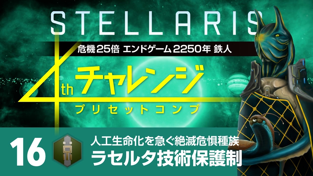 プリセット帝国で危機25倍エンドゲーム2250年鉄人モードに挑むシリーズのハイライト編集版です。<br>「いいね」にこのプリセット帝国のおすすめ度を入れています。<br><br>☆参考動画<br>Stellaris 人工生命の繁殖能力 2214 10/08 人工生命体化 【無編集版】<br><a href="https://youtu.be/oWPZdF-b0CA?si=FxM3W_TkiC8MEgW_" target="_blank" rel="noopener nofollow">https://youtu.be/oWPZdF-b0CA?si=FxM3W_TkiC8MEgW_</a><br><br>【Stellaris1分動画祭】Stellarisで最も影が薄い(?)プリセット帝国 - 古郡 さん<br><a href="https://www.nicovideo.jp/watch/sm43667920" target="_blank" rel="noopener nofollow">https://www.nicovideo.jp/watch/sm43667920</a><br><br>☆自作資料<br>人工生命体生殖能力イベントチャート(PDF)<br><a href="https://drive.google.com/file/d/1aI8g4qABnIIm8IAHchM5ukyY9mXrFxvX/view?usp=sharing" target="_blank" rel="noopener nofollow">https://drive.google.com/file/d/1aI8g4qABnIIm8IAHchM5ukyY9mXrFxvX/view?usp=sharing</a><br><br>デジタル・リファクタリングイベントチャート(PDF)<br><a href="https://drive.google.com/file/d/1ooiY8V4e4LAY3npk9xrfS8xOWDPN9cVP/view?usp=sharing" target="_blank" rel="noopener nofollow">https://drive.google.com/file/d/1ooiY8V4e4LAY3npk9xrfS8xOWDPN9cVP/view?usp=sharing</a><br><br>☆クラウドゲーミングサーバー NVIDIA GeForce NOW<br><a href="https://www.nvidia.com/ja-jp/geforce-now/" target="_blank" rel="noopener nofollow">https://www.nvidia.com/ja-jp/geforce-now/</a><br><br>☆無編集版<br><a href="https://www.youtube.com/playlist?list=PLKTCcuX4WBFmn5JAnZ8LpylHffghqT9-O" target="_blank" rel="noopener nofollow">https://www.youtube.com/playlist?list=PLKTCcuX4WBFmn5JAnZ8LpylHffghqT9-O</a><br><br>☆チャレンジの詳細(予告編)<br><a href="https://www.nicovideo.jp/watch/sm39832845" class="watch">sm39832845</a><br><br>☆ゲーム<br>・Stellaris v3.12.5<br><br>☆設定<br>・危機25倍<br>・ミッドゲーム2225年<br>・エンドゲーム2250年<br>・難易度 元帥<br>・鉄人モード<br>・その他はデフォルト<br><br>☆DLC<br>・The Machine Ageまで全部<br><br>☆MOD<br>・Full Tiny Outliner<br>・Improved Topbar - Extended<br>・Tech Tiers Revealed<br><br>☆ナレーション<br>四国めたん(VOICEVOX)<br><br /><br><span style="color: #262626;">1stチャレンジ(国際地球連合編)⇒ </span><span style="color: #0000ff;"><a href="https://www.nicovideo.jp/series/157544" target="_blank" rel="noopener">series/157544</a></span><br><span style="color: #262626;">2ndチャレンジ(人類共同体編)⇒ </span><span style="color: #0000ff;"><a href="https://www.nicovideo.jp/series/182469" target="_blank" rel="noopener">series/182469</a></span><br><span style="color: #262626;">3rdチャレンジ(ロク機械主義国編)⇒ </span><span style="color: #0000ff;"><a href="https://www.nicovideo.jp/series/207056" target="_blank" rel="noopener">series/207056</a></span><br><span style="color: #262626;">4thチャレンジ(プリセットコンプ)⇒ </span><span style="color: #0000ff;"><a href="https://www.nicovideo.jp/series/287612" target="_blank" rel="noopener">series/287612</a></span><br><span style="color: #262626;">Stellarisマルチプレイ ⇒ </span><span style="color: #0000ff;"><a href="https://www.nicovideo.jp/series/367123" target="_blank" rel="noopener">series/367123</a></span><br><span style="color: #262626;">Stellaris検証動画 ⇒ </span><span style="color: #0000ff;"><a href="https://www.nicovideo.jp/series/202576" target="_blank" rel="noopener">series/202576</a></span><br><span style="color: #262626;">Stellaris妄想動画 ⇒ </span><span style="color: #0000ff;"><a href="https://www.nicovideo.jp/series/310298" target="_blank" rel="noopener">series/310298</a></span><br>Stellaris1分動画祭 ⇒ <a href="https://www.nicovideo.jp/series/404730" target="_blank" rel="noopener">series/404730</a><br><br><br><a target="_blank" href="https://qa.nicovideo.jp/faq/show/19424?site_domain=default" style="font-size: 13px;color: #657586; text-decoration: underline; line-height: 1.4">この動画は投稿者によって修正されました</a>