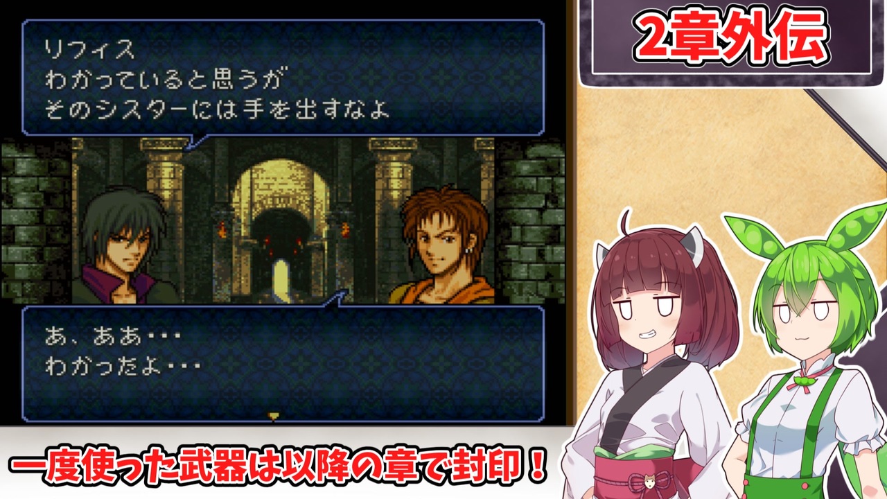 <span style="color: #85200c; font-size: 24px;"><strong><i>前が見えねぇ…</i></strong></span><br><br><br><span style="font-size: 16px;"><strong>1:一度使用した武器種は、以降の章で使用する事を禁止する。<br>2:武器の使用の定義は『その武器を装備した状態で敵との戦闘が発生したタイミング』<br>または『その武器を使って敵に「捕える」コマンドを実行したタイミング』<br>杖の場合は『対象に対して使用した時点(命中の可否は問わない)』とする。 </strong></span><br><span style="color: #ff0000; font-size: 16px;"><strong>※同盟軍、演出による戦闘イベントでは使用した判定にはならないこととする。</strong></span><span style="font-size: 16px;"><strong> <br>3:仲間を47人生存させ、【外伝】を含む全ての章を攻略し、総合評価でB以上の状態でゲームをクリアする。</strong></span><br><br><br>本動画のシリーズリスト【<a href="https://www.nicovideo.jp/series/482976" target="_blank" rel="noopener">series/482976</a>】<br>『烈火』の同縛りプレイ【<a href="https://www.nicovideo.jp/series/406473" target="_blank" rel="noopener">series/406473</a>】<br>『封印』の同縛りプレイ【<a href="https://www.nicovideo.jp/series/316824" target="_blank" rel="noopener">series/316824</a>】<br>前:【<a href="https://www.nicovideo.jp/watch/sm44033494" class="watch">sm44033494</a>】次:【<a href="https://www.nicovideo.jp/watch/sm44095223" class="watch">sm44095223</a>】<br><br><strong>使用したソフト</strong><br>VOICEROID+東北きりたんEX<br>VOICEVOX:ずんだもん<br>VOICEPEAK ずんだもん<br><strong>お借りした素材</strong><br>ニコニコモンズの皆様(コンテンツツリー参照)
