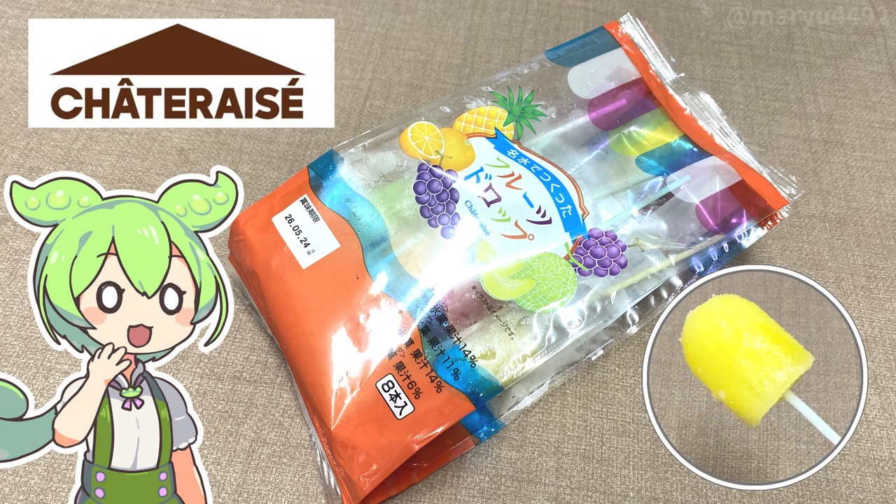 商品名は「名水で作ったフルーツドロップ」と言うそうです。<br> ※税別120円(税込み129円)<br><br><br><br> 【関連動画】<br> シャトレーゼの看板商品「チョコバッキー」<br> <a href="https://www.nicovideo.jp/watch/sm43985717" target="_blank" rel="noopener nofollow">https://www.nicovideo.jp/watch/sm43985717</a><br><br>【参考】<br> 名水でつくったフルーツドロップ(シャトレーゼオンラインショップ) <br><a href="https://www.chateraise.co.jp/ec/g/g1002279/" target="_blank" rel="noopener nofollow">https://www.chateraise.co.jp/ec/g/g1002279/</a> <br>スイカアイスバー 6本入(シャトレーゼオンラインショップ) <br><a href="https://www.chateraise.co.jp/ec/g/g999824/" target="_blank" rel="noopener nofollow">https://www.chateraise.co.jp/ec/g/g999824/</a><br><br>【使用した素材】(※敬称略) <br>(合成音声)VOICEVOX/ずんだもん/四国めたん /春日部つむぎ<br><a href="https://voicevox.hiroshiba.jp/" target="_blank" rel="noopener nofollow">https://voicevox.hiroshiba.jp/</a> <br>(立ち絵)坂本アヒル<br> <a href="https://seiga.nicovideo.jp/seiga/im10788496" target="_blank" rel="noopener">im10788496</a>/<a href="https://seiga.nicovideo.jp/seiga/im10791276" target="_blank" rel="noopener">im10791276</a> <br>(楽曲)甘茶の音楽工房/「楽しい麦畑」「お城の舞踏会」<br> <a href="https://amachamusic.chagasi.co" target="_blank" rel="noopener nofollow">https://amachamusic.chagasi.co</a>