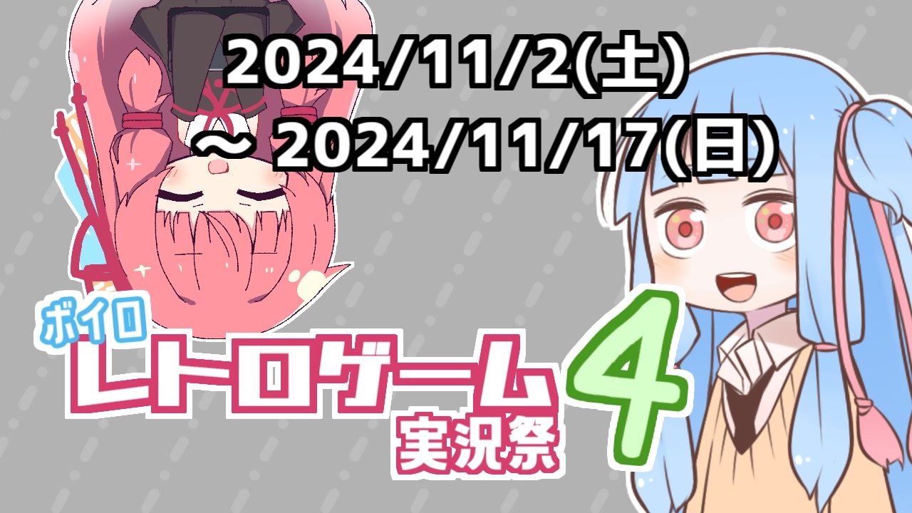 よろしくお願いします!!!!!!!!!!!<br><br><strong><開催期間><br> 2024/11/2(土) 0:00 ~ 2024/11/17(日) 23:59<br><br><br><レギュレーション関係><br> 企画要項:</strong><a href="https://note.com/voiro_retro/n/n3d883ba2d5b2" target="_blank" rel="noopener nofollow">https://note.com/voiro_retro/n/n3d883ba2d5b2</a><br><strong> QAまとめ:</strong><a href="https://note.com/voiro_retro/n/need411c3bd46" target="_blank" rel="noopener nofollow">https://note.com/voiro_retro/n/need411c3bd46</a><br><strong> ゲーム機世代分類:</strong><a href="https://ja.wikipedia.org/wiki/%E3%82%B2%E3%83%BC%E3%83%A0%E6%A9%9F" target="_blank" rel="noopener nofollow">https://ja.wikipedia.org/wiki/%E3%82%B2%E3%83%BC%E3%83%A0%E6%A9%9F</a><br><br><br><strong><投稿祭ロゴ></strong><br> <a href="https://seiga.nicovideo.jp/seiga/im11476810" target="_blank" rel="noopener">im11476810</a><br> <br><br><strong><連絡先></strong><br> <a href="https://twitter.com/pukkuraa" target="_blank" rel="noopener nofollow">https://twitter.com/pukkuraa</a><br><br><br>企画説明 :琴葉葵<br>アシスタント:琴葉茜、紲星あかり<br><br><br>BGM:魔王魂