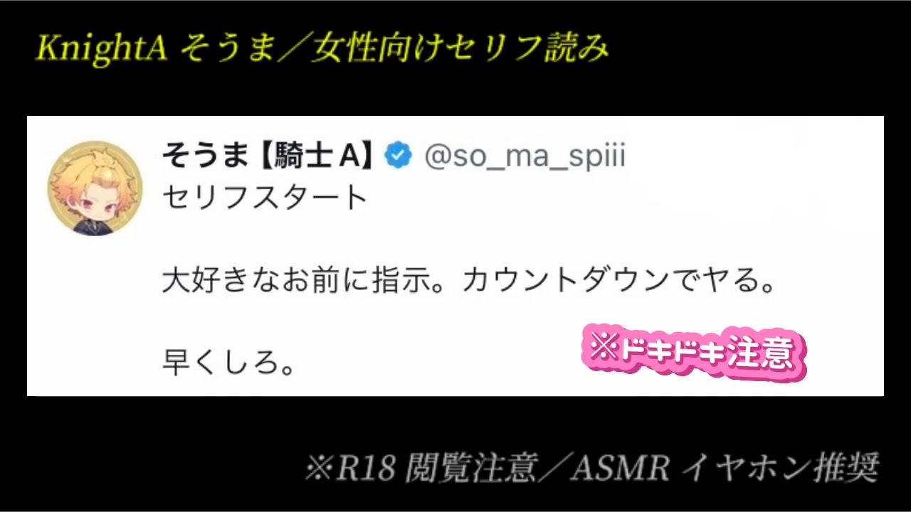 セリフの後、イチャイチャがあったので少し雑談を含め残しました。<br>(尚、雑談は全部ではありません。編集してます)<br>38:51 ~ 雑談<br>46:00 ~ ドキドキ注意♡<br><br>9/3配信で読まれたセリフです<br>(ツイキャス/ASMR配信)<br><a href="https://twitcasting.tv/c:soma_voice0310" target="_blank" rel="noopener nofollow">https://twitcasting.tv/c:soma_voice0310</a><br><br>【R18】焦らしオナ指示フリー台本<br>※あらすじ無し<br><a href="https://www.pixiv.net/novel/show.php?id=17188005" target="_blank" rel="noopener nofollow">https://www.pixiv.net/novel/show.php?id=17188005</a><br><br>〈pixiv〉<br>オリジナル台本/悠希 様<br>Xアカウント(@yuuki_script )<br><br>------------------<br><br>そうまくん<br>[Xアカウント]<br>@soma_voice /@so_ma_spiii<br><br>[YouTube]<br><a href="https://youtube.com/@soma_voice_" target="_blank" rel="noopener nofollow">https://youtube.com/@soma_voice_</a><br><br>(セリフ専用)<br><a href="https://youtube.com/@soma_voice" target="_blank" rel="noopener nofollow">https://youtube.com/@soma_voice</a><br><br>[インスタ]<br><a href="https://www.instagram.com/soma_life" target="_blank" rel="noopener nofollow">https://www.instagram.com/soma_life</a><br>