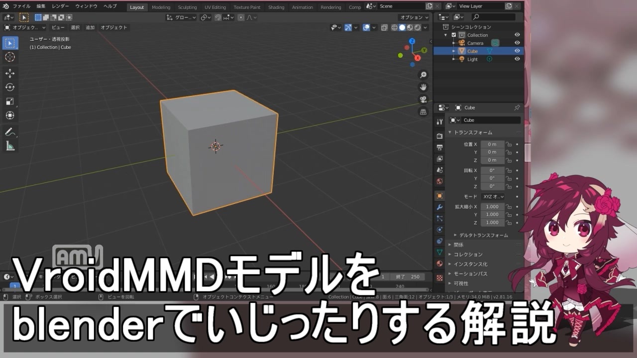 人を傷つけるようなコメント・誹謗中傷は絶対に禁止です!<br><br>追加解説動画→<a href="https://www.nicovideo.jp/watch/sm44084588" class="watch">sm44084588</a><br><br>VroidMMD界に貢献したかったけど動画が40分超えちゃってめちゃ見づらい…すまねえ…<br>解説するにあたって完成してない状態のモデルなどが出てきたりします!ご注意ください!<br>今回もテキトーなこと言ってるので笑って許してあげてね…編集ミスとかも大いに含まれますのでご注意ください!<br><br>・blenderの基本操作<br>[<a href="#" class="seekTime" data-seekTime="0:43" onclick="seekNicoPlayer('#0:43'); return false;">#0:43</a>]<br><br>・blenderでのVRoidモデルの顔調整、PMXエディターでの変形の適応<br>[<a href="#" class="seekTime" data-seekTime="05:12" onclick="seekNicoPlayer('#05:12'); return false;">#05:12</a>]<br><br>・blenderで衣装の厚みを付ける<br>[<a href="#" class="seekTime" data-seekTime="10:53" onclick="seekNicoPlayer('#10:53'); return false;">#10:53</a>]<br><br>・袖回りのUV展開<br>[<a href="#" class="seekTime" data-seekTime="14:09" onclick="seekNicoPlayer('#14:09'); return false;">#14:09</a>]<br><br>・blenderで体の調整、ウェイトの調整<br>[<a href="#" class="seekTime" data-seekTime="16:57" onclick="seekNicoPlayer('#16:57'); return false;">#16:57</a>]<br><br>・PMXエディターで髪のテクスチャを変更する(ペイントツールを使用)<br>[<a href="#" class="seekTime" data-seekTime="30:30" onclick="seekNicoPlayer('#30:30'); return false;">#30:30</a>]<br><br>・VRoidで作った髪アクセサリーの追従変更を行う<br>[<a href="#" class="seekTime" data-seekTime="36:51" onclick="seekNicoPlayer('#36:51'); return false;">#36:51</a>]<br><br>となります!<br><br><br>~お借りしたツール~<br><br>3Dキャラクター制作ソフトウェア<br>VRoidstudio<br><a href="https://vroid.com/" target="_blank" rel="noopener nofollow">https://vroid.com/</a><br><br>MikuMikuDance<br><a href="https://www.nicovideo.jp/watch/sm2420025" class="watch">sm2420025</a><br><br>PMXエディタ_0210<br><a href="https://kkhk22.seesaa.net/article/282936786.html" target="_blank" rel="noopener nofollow">https://kkhk22.seesaa.net/article/282936786.html</a><br><br>MMD変換したVRM(Vroid)を使いやすく最適化<br><a href="https://booth.pm/ja/items/1329577" target="_blank" rel="noopener nofollow">https://booth.pm/ja/items/1329577</a><br><br><span style="font-size: 10px;">↓現在はVRoid2PMXに対応したそうです!</span><br> Pmx変換したVroidを(追加)最適化 [Vroid2Pmx対応版]<br><a href="https://booth.pm/ja/items/3483997" target="_blank" rel="noopener nofollow">https://booth.pm/ja/items/3483997</a><br><br>【VRoid】ワンクリックでVRMをPMXに変換するツール【MMD】<br>VRM2PMXConverter<br><a href="https://www.nicovideo.jp/watch/sm34705374" class="watch">sm34705374</a><br><br>上記ソフトウェア開発者様に感謝です!ありがとうございます!<br>その他お借りしたものはコンテンツツリーにて!<br><br><span style="font-size: 10px;">解説してほしいVroidMMDネタがあれば教えてくれると嬉しいです…!!<br>何かあればツイッターにご連絡ください!</span><br>Twitter(@sawaganiONASU)
