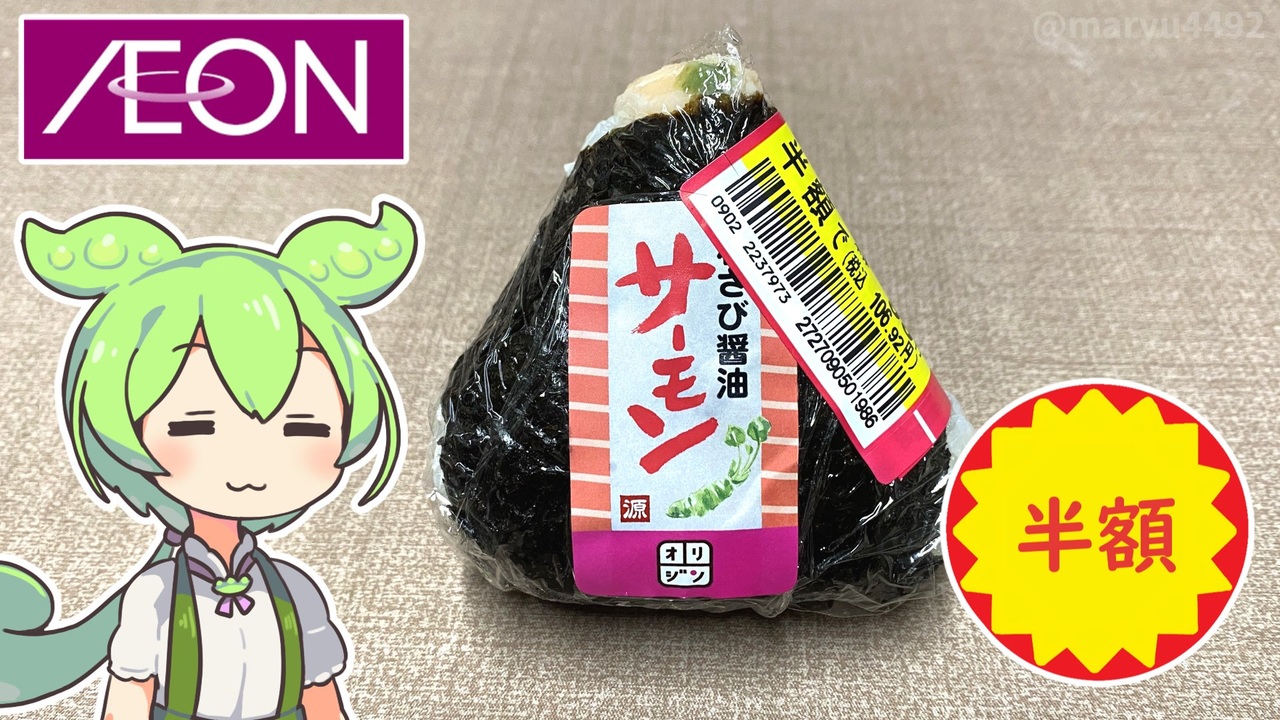イオンで買った半額のおにぎりです。 <br><br><br><br> 【参考】 <br>オリジン東秀株式会社<br> <a href="https://www.toshu.co.jp/index.html" target="_blank" rel="noopener nofollow">https://www.toshu.co.jp/index.html</a> <br>事業紹介(オリジン東秀株式会社) <br><a href="https://www.toshu.co.jp/company/brand.html" target="_blank" rel="noopener nofollow">https://www.toshu.co.jp/company/brand.html</a> <br><br>【使用した素材】(※敬称略) <br>(合成音声)VOICEVOX/ずんだもん/四国めたん<br> <a href="https://voicevox.hiroshiba.jp/" target="_blank" rel="noopener nofollow">https://voicevox.hiroshiba.jp/</a> <br>(立ち絵)坂本アヒル<br> <a href="https://seiga.nicovideo.jp/seiga/im10788496" target="_blank" rel="noopener">im10788496</a>/<a href="https://seiga.nicovideo.jp/seiga/im10791276" target="_blank" rel="noopener">im10791276</a> <br>(楽曲)甘茶の音楽工房/「楽しい麦畑」「フルーツパフェ」「お城の舞踏会」 <br><a href="https://amachamusic.chagasi.co" target="_blank" rel="noopener nofollow">https://amachamusic.chagasi.co</a>