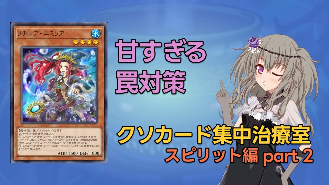 パルミジャーノ根岸です。<br>世の中実践でしか得られない知見というものは多いものです。<br>とくにおまえ(エミリア)<br><br>実は今回が私史上初のpart2です、part3も出すよ<br><br>コメントいっぱいありがとう<br>いいねはちょっとした裏話<br><br>※クソカードやカードの治療の定義はありません、対戦相手や別投稿者など、私以外へ批判は絶対にしないでください<br><br>コメント返信やスピリットの評価についてのnote(24年9月版)<br>今回のエミリアのランク改定もこちらで<br><a href="https://note.com/parmigiano_negi/n/n9a483f0c1794" target="_blank" rel="noopener nofollow">https://note.com/parmigiano_negi/n/n9a483f0c1794</a><br><br>あまくだりさんリスペクト動画です<br>本家様:<a href="https://www.nicovideo.jp/user/82678858/series/321504" target="_blank" rel="noopener nofollow">https://www.nicovideo.jp/user/82678858/series/321504</a><br><br>なにかと知見を高めるのに役立つ非公式医学会サーバー<br>→<a href="https://discord.gg/pejHy5mQFT" target="_blank" rel="noopener nofollow">https://discord.gg/pejHy5mQFT</a><br><br>使用音源:ニコニ・コモンズ<br>編集ソフト:ゆっくりムービーメーカー4<br>VOICEVOX:冥鳴ひまり(EXVOICEあり)<br><br>撮影協力<br>nexusさん<br><br>使用楽曲1:Crystallize<br>楽曲提供:SHUNTA<br>使用楽曲2:奪還のヴェルデ<br>楽曲提供:きゅうりジャム<br>使用楽曲3:picoっとね☆<br>楽曲提供:んぃん<br><br>カード画像は遊戯王マスターデュエルのものを使用しています。<br><br>投稿者Twitter:<a href="https://twitter.com/cheeseandfamily?s=20" target="_blank" rel="noopener nofollow">https://twitter.com/cheeseandfamily?s=20</a><br>生存確認はこちら。<br><br>広告をしてくださった方:F_tyuniさん、nexusさん、マディリアスさん、ヌケニン@いのちのたまさん、Precisさん、Grassさん、ヘテロフィルスさん、名無しさん、凛霞さん、mujinaさん、Ignition Beastさん、アキアカネさん、lemoさん、フォルカさん、思い出のブランコさん、ナタリアさん、sumibiyakiさん、島田兵さん、フリー素材あそびさん、ワヘフさん、仮名:歴史好きな人さん、ばんてふさん、まぎくさん、ゲストさん、鉄鼠さん、@娘々さん、譲葉にりさん、nanashiさん、凛拿さん、夢見兎さん<br>ありがとうございます!<br><br>前回:<a href="https://www.nicovideo.jp/watch/sm43985730" class="watch">sm43985730</a><br>次回:ちょい難航中 10月にはなにか出します<br>