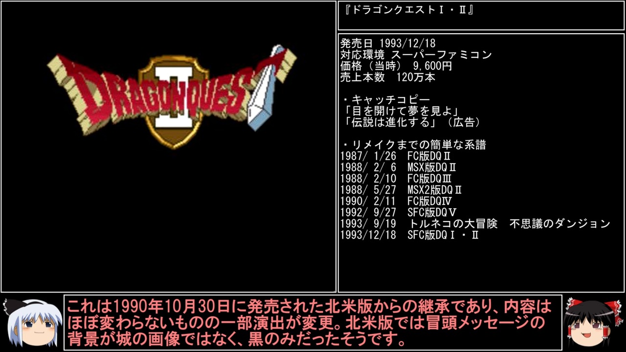 DQⅡの2周目、SFCDQⅡ編part1です。 <br>SFC版Ⅱは前作以来で約3年半振りに遊ぶので、流石にピロピロの幻聴は聞こえませんでした。<br>そしてやっぱりSFCで聴く曲が一番好きですね。Cパートあるのが好き!<br><br>前→<a href="https://www.nicovideo.jp/watch/sm44077875" class="watch">sm44077875</a><br>次→<a href="https://www.nicovideo.jp/watch/sm44119720" class="watch">sm44119720</a><br><br>YouTube版→<a href="https://youtu.be/lADrMfceLPQ" target="_blank" rel="noopener nofollow">https://youtu.be/lADrMfceLPQ</a><br><br>縛りルール(詳細はpart1参照)<br>①一度使った武器・防具・装飾品・道具・呪文・特技は<br> 次作品以降使用禁止。(売却も解禁扱い)<br><br> 一度使った職業(3,6,7)・仲間モンスター(5,6)・スカウトモンスター(8)は<br> 戦士(Ⅲ)、戦士(Ⅵ)のようにナンバリングで分類し次作品以降使用禁止。<br> また複数体加入できる仲間モンスターは一体まで。<br><br>②裏技、バグ技、全滅、逃走、おどかす禁止。<br> またダンジョン攻略とボス戦における状況再現禁止。<br><br>③ダンジョンとボス攻略は、全キャラのレベルを突入時、<br> 1周目は目標レベル+5。2周目は+10。3周目は+15まで。<br> ラスボスの目標レベルは45。裏ボスは50とする。<br>(目標レベルは各公式ガイドブックを参照)<br><br>④1周目はEDまで。2周目は裏ボス撃破まで。<br> 3周目は全てのボスを規定回数、規定ターン以内に倒す。<br>(回避可能なボスも倒し、闇ゾーマは3周全てで倒す)<br><br><br><span style="color: #262626;">※一部機種は互換機を使用してのプレイとなりますが、倍速機能やクイックセーブ・ロード、チートなどは一切使用しません。</span><br><br>※ネタバレ注意です<br><br>この動画で利用している株式会社スクウェア・エニックスを代表とする共同著作者が権利を所有する著作物及びスギヤマ工房有限会社が権利を所有する楽曲の転載・配布は禁止いたします。<br>(C) ARMOR PROJECT/BIRD STUDIO/SQUARE ENIX All Rights Reserved.<br>(C) SUGIYAMA KOBO (P) SUGIYAMA KOBO<br><br>AquesTalk2ライセンスID:AQTK2WINUSR23122185<br /><br><br>❤いいねを押していただけるとモチベーションと投稿速度が上がるので宜しくお願い致します!<br><br>作者ツイッター→ <a href="https://twitter.com/nig0117" target="_blank" rel="noopener nofollow">https://twitter.com/nig0117</a><br>PIXIV FANBOX→ <a href="https://sutanokeiji.fanbox.cc/" target="_blank" rel="noopener nofollow">https://sutanokeiji.fanbox.cc/</a><br><br>( 以前はWEB小説書いてました→ <a href="https://kakuyomu.jp/works/1177354054884910267" target="_blank" rel="noopener nofollow">https://kakuyomu.jp/works/1177354054884910267</a> )