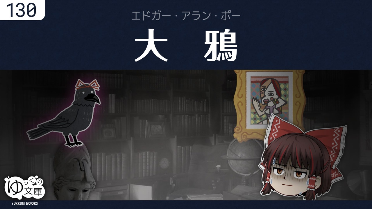 <span style="color: red;"><strong>130 Nevermore──</strong></span><br>嵐の夜、学生が本を読んでいると、大きな鴉が部屋に飛び込んできた。大鴉はなにを訊いても「Nevermore(ありませぬ)」としか答えないが、学生は問答する中で正気を失ってゆく。<br><span style="color: green;">The Raven (1845) by Edgar Allan Poe</span><br><br>(うp主より)数年前から制作を検討していたが、詩を翻案することに抵抗があり、完成できずにいた。先日、ふかみどりさんが投稿。制作しながら読んだとのこと。うぬれ! <strong>やりやがったな!</strong> カッとなって、完成させてしまった。やられなかったら、やり遂げられなかった。カウンターで発動する創作意欲があった。ふかみどりさん、感謝。<br>#<a href="https://www.nicovideo.jp/watch/sm44059832" class="watch">sm44059832</a> 【ふかみどり】大鴉<br>---<br>終わりのない追悼は、魂を枯れさせる「内なる魔物」だ。対策は簡単で、忘れてしまえばいい。気にしなければいい。自分にそれができるのか、試される機会が訪れないことを願う。<br><br>(私の読み解き)<a href="https://x.com/trynext/status/1835142816026313207" target="_blank" rel="noopener nofollow">https://x.com/trynext/status/1835142816026313207</a><br>---<br>AI生成画像を使ってみた。<br><br><strong>●ゆっくり文庫:アメリカ文学</strong><br><a href="https://www.nicovideo.jp/watch/sm22164912" class="watch">sm22164912</a> エドガー・アラン・ポー「黒猫」<br><a href="https://www.nicovideo.jp/watch/sm22187238" class="watch">sm22187238</a> エドガー・アラン・ポー「黒猫」拡張エンディング<br><a href="https://www.nicovideo.jp/watch/sm29016999" class="watch">sm29016999</a> エドガー・アラン・ポー「早すぎた埋葬」<br><a href="https://www.nicovideo.jp/watch/sm44100694" class="watch">sm44100694</a> <span style="color: #ff00ff;"><strong>エドガー・アラン・ポー「大鴉」</strong></span><br><a href="https://www.nicovideo.jp/watch/sm22643203" class="watch">sm22643203</a> ビアス「アウル・クリーク橋の出来事」<br><a href="https://www.nicovideo.jp/watch/sm24931315" class="watch">sm24931315</a> ボーム「オズの魔法使い」<br><a href="https://www.nicovideo.jp/watch/sm29541333" class="watch">sm29541333</a> ヘミングウェイ「キリマンジャロの雪」<br><a href="https://www.nicovideo.jp/watch/sm22215535" class="watch">sm22215535</a> O・ヘンリー「賢者の贈り物」<br><a href="https://www.nicovideo.jp/watch/sm32359748" class="watch">sm32359748</a> O・ヘンリー「運命の道」<br><a href="https://www.nicovideo.jp/watch/sm37985228" class="watch">sm37985228</a> O・ヘンリー「魔女のパン」<br><a href="https://www.nicovideo.jp/watch/sm44016618" class="watch">sm44016618</a> O・ヘンリー「心と手」<br><br><strong>●ゆっくり文庫について</strong><br>全部:<a href="https://www.nicovideo.jp/mylist/74874627" target="_blank" rel="noopener">mylist/74874627</a><br>近況:<a href="https://twitter.com/trynext" target="_blank" rel="noopener nofollow">https://twitter.com/trynext</a><br>---<br><br><br>
