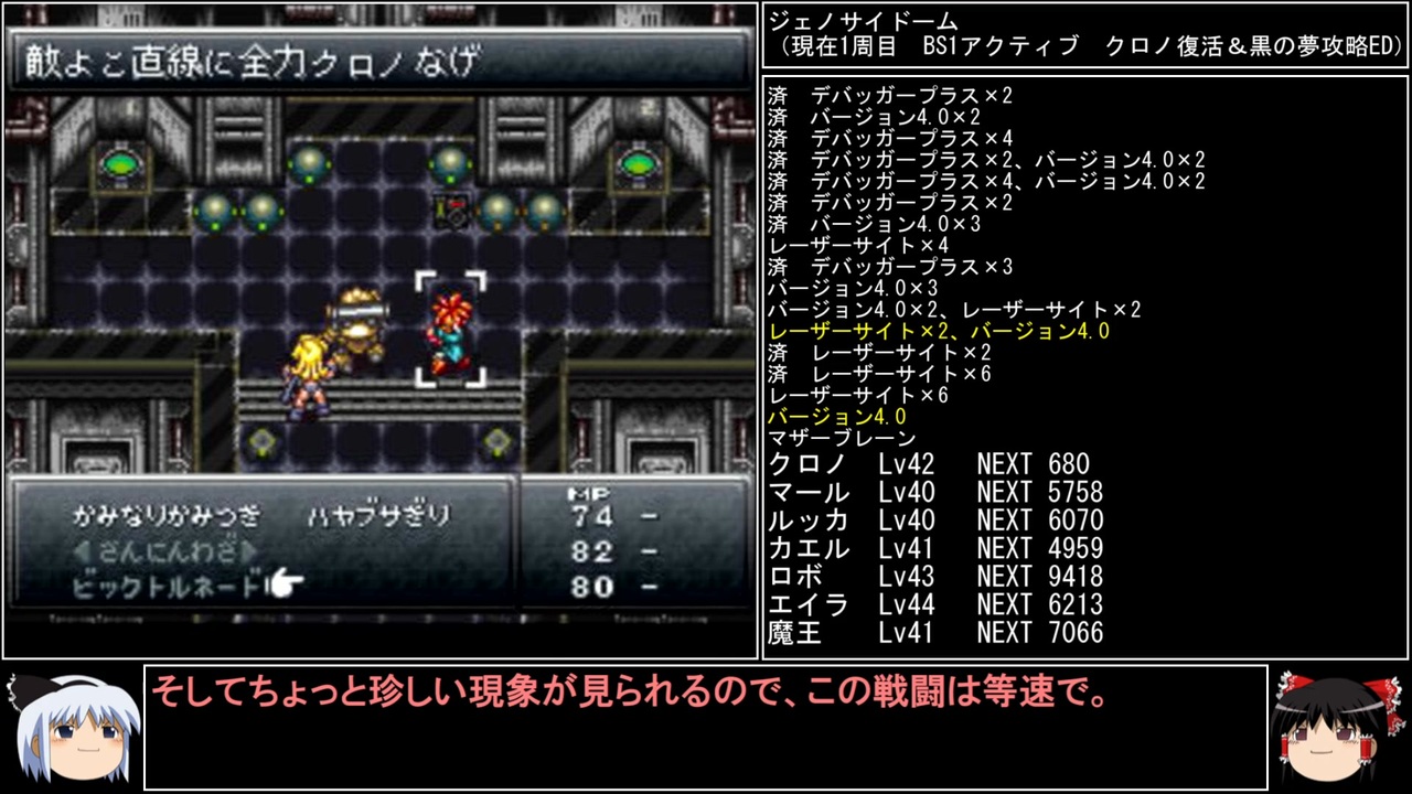 じごくなげを解禁した一番の理由は、経験値328のためだったり?<br>ジェノサイドームの敵かさ増しは、自分もテストプレイ中に偶然見つけたので知らない人も多そうです。<br>(※恐竜人のアジトの右下穴の2戦が、戦闘済みなのに済マークが消えていました。すいません)<br><br>前→<a href="https://www.nicovideo.jp/watch/sm44077820" class="watch">sm44077820</a><br>次→<a href="https://www.nicovideo.jp/watch/sm44123076" class="watch">sm44123076</a><br><br>YouTube版→<a href="https://youtu.be/5r67RKOtCoo" target="_blank" rel="noopener nofollow">https://youtu.be/5r67RKOtCoo</a><br><br>縛りルール<br>①一度使った武器・防具・アクセサリー・道具・技・連携は<br> 次周回以降使用禁止(売却も解禁扱い)<br><br>②一度戦った敵シンボルとの再戦禁止。<br><br>③初戦闘の敵からの逃走禁止。<br><br>④裏技、バグ技、状況再現禁止。<br><br>⑤BS1アクティブからBS8ウェイトまで<br> 全てのバトルスピードとバトルモードで攻略する。<br><br>⑥各周回において見る予定のED条件を<br> 満たした段階で即ラヴォスと戦いに行く。<br><br>※ネタバレ注意です<br><br>このページ、動画で利用している弊社または弊社のライセンサーが権利を有する著作物の転載・配布は禁止いたします。<br>© 1995, 2018 SQUARE ENIX<br>Illustration: © 1995 BIRD STUDIO / SHUEISHA<br>Story and Screenplay: © 1995, 2008 ARMOR PROJECT / SQUARE ENIX<br><br>AquesTalk2ライセンスID:AQTK2WINUSR23122185<br /><br><br>❤いいねを押していただけるとモチベーションと投稿速度が上がるので宜しくお願い致します!<br><br>作者ツイッター→ <a href="https://twitter.com/nig0117" target="_blank" rel="noopener nofollow">https://twitter.com/nig0117</a><br>PIXIV FANBOX→ <a href="https://sutanokeiji.fanbox.cc/" target="_blank" rel="noopener nofollow">https://sutanokeiji.fanbox.cc/</a><br><br>( 以前はWEB小説書いてました→ <a href="https://kakuyomu.jp/works/1177354054884910267" target="_blank" rel="noopener nofollow">https://kakuyomu.jp/works/1177354054884910267</a> )
