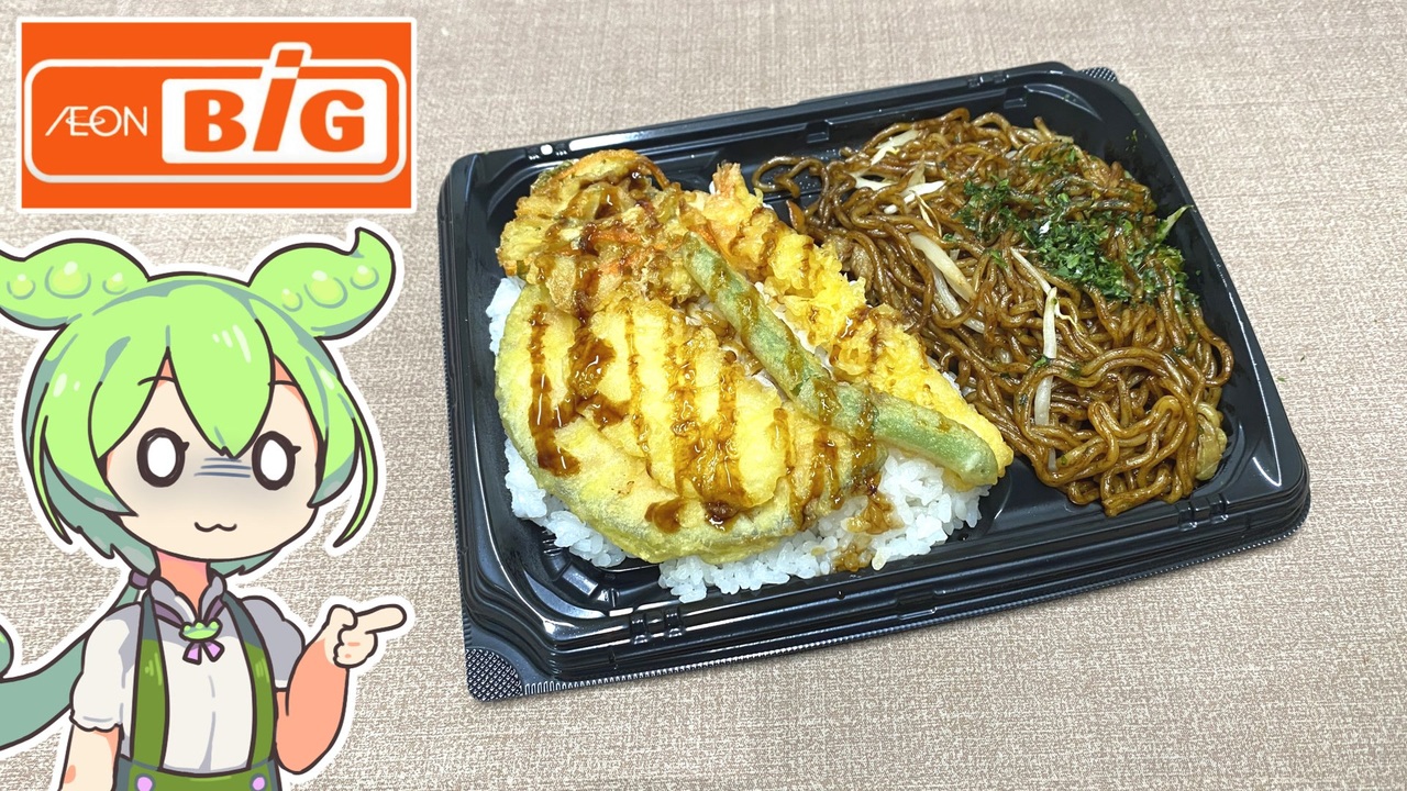 天丼に焼きそばを組み合わせたお弁当です。 <br><br><br>【関連動画】<br> トップバリュの黄色いヤツ「ドンキみたいな商品名の冷凍食品」2024.02.10 <br><a href="https://www.nicovideo.jp/watch/sm43358025" target="_blank" rel="noopener nofollow">https://www.nicovideo.jp/watch/sm43358025</a><br>ビッグの「中身が見えるようになったお弁当(297円)」2024.09.08<br> <a href="https://www.nicovideo.jp/watch/sm44073982" target="_blank" rel="noopener nofollow">https://www.nicovideo.jp/watch/sm44073982</a><br><br>【参考】<br> イオンビッグ株式会社<br> <a href="https://www.aeonbig.co.jp/" target="_blank" rel="noopener nofollow">https://www.aeonbig.co.jp/</a><br><br>【使用した素材】(※敬称略) <br>(合成音声)VOICEVOX/ずんだもん/四国めたん<br> <a href="https://voicevox.hiroshiba.jp/" target="_blank" rel="noopener nofollow">https://voicevox.hiroshiba.jp/</a> <br>(立ち絵)坂本アヒル<br> <a href="https://seiga.nicovideo.jp/seiga/im10788496" target="_blank" rel="noopener">im10788496</a>/<a href="https://seiga.nicovideo.jp/seiga/im10791276" target="_blank" rel="noopener">im10791276</a> <br>(楽曲)甘茶の音楽工房/「楽しい麦畑」「フルーツパフェ」「お城の舞踏会」 <br><a href="https://amachamusic.chagasi.co" target="_blank" rel="noopener nofollow">https://amachamusic.chagasi.co</a>