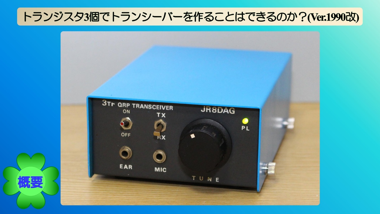 「トランジスタ3個でトランシーバーを作ることはできるのか?」と題して製作したトランジスタを3個だけ使用した50MHz(6m) QRP DSBトランシーバー(Ver.1990改)の概要です。<br>本作品は、「トランジスタ3個でトランシーバーを作ることはできるのか?(<strong><a href="https://www.nicovideo.jp/watch/sm28298075" class="watch">sm28298075</a></strong>)」の動画で紹介した2作品のうち、回路変更のしやすい構造であった3TRX-2について課題であった送受信性能の低さを改善するための改良を行ったものです。<br>名称はトランジスタ3個の6mトランシーバーの2号機という意味で「<span style="color: #0000ff;"><strong>3TRX-2</strong></span>」としています。<br><br><strong>ニコニ広告ありがとうございます</strong> > <span style="color: #0000ff;"><strong>おみづ食べたいさん、NESA98さん、さとるさん、Ryoheiさん</strong></span><br><br><a href="https://www.nicovideo.jp/mylist/70340445" target="_blank" rel="noopener">mylist/70340445</a> トランジスタ3個でトランシーバーを作ることはできるのか?<br>関連動画 <a href="https://www.nicovideo.jp/watch/sm28298075" class="watch">sm28298075</a> (Ver.1990) <a href="https://www.nicovideo.jp/watch/sm37216605" class="watch">sm37216605</a>(Ver.1990改,1分弱タグ解説動画) <a href="https://www.nicovideo.jp/watch/sm43919647" class="watch">sm43919647</a>(Ver.2020)<br><a href="https://www.nicovideo.jp/watch/sm32468165" class="watch">sm32468165</a>(交信の様子) <a href="https://seiga.nicovideo.jp/seiga/im10674757" target="_blank" rel="noopener">im10674757</a>(回路図)<br>作品概要:<a href="http://jr8dag.la.coocan.jp/3trx2/3trx2_00.htm" target="_blank" rel="noopener nofollow">http://jr8dag.la.coocan.jp/3trx2/3trx2_00.htm</a><br><br>動画作成にあたり、以下の音楽素材等を使用しています(作者はすべてJR8DAG)。<br>・<a href="https://commons.nicovideo.jp/works/nc185755" target="_blank" rel="noopener">nc185755</a> 公園散策<br>・<a href="https://commons.nicovideo.jp/works/nc204903" target="_blank" rel="noopener">nc204903</a> 趣味の時間(long ver.)<br>・<a href="https://commons.nicovideo.jp/works/nc177832" target="_blank" rel="noopener">nc177832</a> 穏やかな風<br>その他の使用素材についてはコンテンツツリーをご覧願います。<br><br><a href="https://www.nicovideo.jp/mylist/54161747" target="_blank" rel="noopener">mylist/54161747</a> JR8DAG製作の自作品<br><br>JR8DAG/M.Kanno