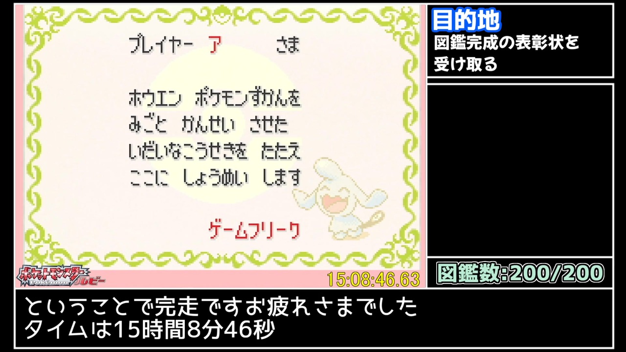 図鑑完成まで<br><br>・計測方法<br>-開始:どちらかのソフトで「さいしょからはじめる」を選択したタイミング<br>-終了:どちらかのソフトでホウエン図鑑完成の賞状が表示されたタイミング<br><br>・捕捉<br>-使用ソフトはルビー・サファイア1本ずつ <br>-バグ技無し <br>-通信中以外の同時操作無し <br>-ジラーチ、デオキシスは不要<br><br>全part結合版<br><a href="https://youtu.be/DZr0G_o7LaY" target="_blank" rel="noopener nofollow">https://youtu.be/DZr0G_o7LaY</a><br><br>無編集の記録動画<br><a href="https://youtu.be/cCxyJCBsahA" target="_blank" rel="noopener nofollow">https://youtu.be/cCxyJCBsahA</a><br><br>前←<a href="https://www.nicovideo.jp/watch/sm44118190" class="watch">sm44118190</a><br><br>投稿したRTA解説part1まとめ<br><a href="https://www.nicovideo.jp/mylist/67368614" target="_blank" rel="noopener">mylist/67368614</a>