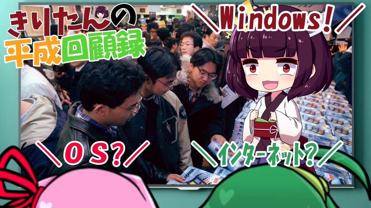 <strong>ようこそ! 平成回顧録へ!</strong><br><br>今でこそ当たり前に使っているパソコンやインターネットにも、もちろん初めてというタイミングが存在します。黎明期から見てきた人間でないと、そういう観点て意外にわからないものなんだと思います。<br>過去を知るにつれ、そう感じるようになりました。<br><br>では、ごゆっくりとお楽しみください!<br><br><a href="https://www.nicovideo.jp/watch/sm44096779" class="watch">sm44096779</a> ← 前 次 → <a href="https://www.nicovideo.jp/watch/sm44149422" class="watch">sm44149422</a><br>回顧目録 → <a href="https://www.nicovideo.jp/mylist/76747431" target="_blank" rel="noopener">mylist/76747431</a><br>YouTube版 → <a href="https://youtu.be/G-pwO9IMfsk" target="_blank" rel="noopener nofollow">https://youtu.be/G-pwO9IMfsk</a><br><br>シリーズ一話マイリスト →<span style="color: #006699;"> </span><a href="https://www.nicovideo.jp/mylist/69322831" target="_blank" rel="noopener">mylist/69322831</a><br>試作品マイリスト → <a href="https://www.nicovideo.jp/mylist/69322827" target="_blank" rel="noopener">mylist/69322827</a><br><br>更新情報とか質問とかX(ツイッター) → <a href="https://twitter.com/suzakatsuki " target="_blank" rel="noopener nofollow">https://twitter.com/suzakatsuki </a><br><br>~お借りしたもの~<br>立ち絵:blueberry様(SD東北きりたん他)、りんどう様(ボイロミニキャラ後ろ姿素材)<br>背景小物類:写真AC様<br> イラストAC様<br>BGM:こんとどぅふぇ HiLi様いっしょ、港町ポルカ、目が覚めた<br>効果音:効果音ラボ様<br> On-Jin ~音人~様<br> <br><br>※リンク情報などは、マイリストの説明欄にて補足しています。