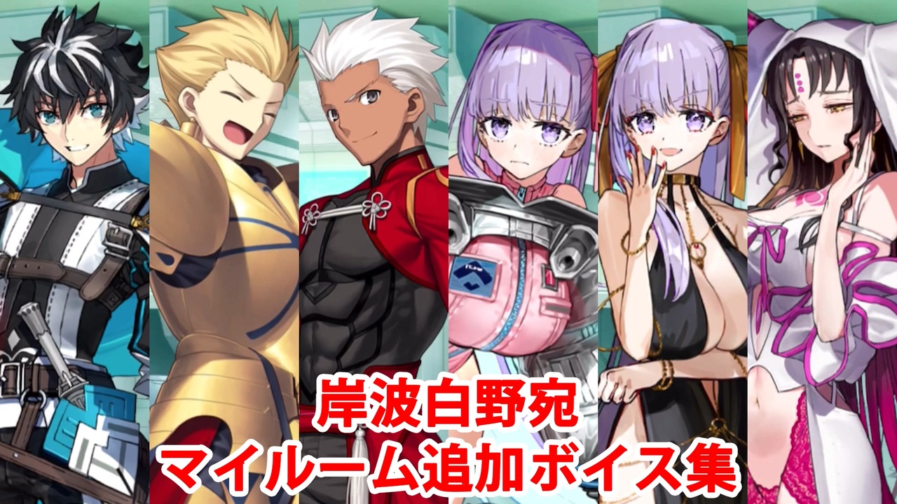 岸波白野宛に追加されたマイルームボイスのまとめです。<br>エミヤとBBドバイは女性限定ボイスです。<br><br>※エミヤの男性宛ボイスは未収録です。<br><br>対象者は以下の6サーヴァントです。<br> ・エミヤ(CV:諏訪部順一)<br> ・ギルガメッシュ(CV:関智一)<br> ・シャルルマーニュ(CV:木村良平)<br> ・殺生院キアラ(CV:田中理恵)<br> ・BBドバイ(CV:下屋則子)<br> ・BBコスモ(CV:下屋則子)<br><br>YouTube版はこちら<br><a href="https://www.youtube.com/watch?v=x8wIwrRd9hk" target="_blank" rel="noopener nofollow">https://www.youtube.com/watch?v=x8wIwrRd9hk</a><br><br />投稿済ボイス集→<a href="https://www.nicovideo.jp/mylist/57873980" target="_blank" rel="noopener">mylist/57873980</a>、<a href="https://www.nicovideo.jp/mylist/68037946" target="_blank" rel="noopener">mylist/68037946</a>、<a href="https://www.nicovideo.jp/mylist/76708013" target="_blank" rel="noopener">mylist/76708013</a>