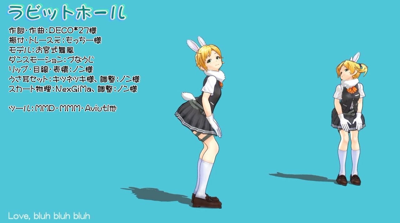 すばらしい楽曲、すばらしい振付と踊りに感謝します。<br>このモーションのご利用にあたっては、必ずreadmeをご一読ください。<br><br>モーション配布先:<a href="https://bowlroll.net/file/324877" target="_blank" rel="noopener nofollow">https://bowlroll.net/file/324877</a><br><br>作詞・作曲:DECO*27様 <a href="https://www.nicovideo.jp/watch/sm42224358" target="_blank" rel="noopener nofollow">https://www.nicovideo.jp/watch/sm42224358</a><br>振付・トレース元:もっちー様 <a href="https://www.nicovideo.jp/watch/sm42644170" target="_blank" rel="noopener nofollow">https://www.nicovideo.jp/watch/sm42644170</a><br>モデル:お宮式舞風 <a href="https://www.nicovideo.jp/watch/sm28414111" target="_blank" rel="noopener nofollow">https://www.nicovideo.jp/watch/sm28414111</a><br>ダンスモーション:づなうじ <a href="https://www.nicovideo.jp/watch/sm44128454" target="_blank" rel="noopener nofollow">https://www.nicovideo.jp/watch/sm44128454</a><br>リップ・目線・表情:ノン様 <a href="https://seiga.nicovideo.jp/seiga/im9231038" target="_blank" rel="noopener nofollow">https://seiga.nicovideo.jp/seiga/im9231038</a><br>ツール:MMD・MMM・Aviutl他<br><br>X(旧ツイッター):<a href="https://x.com/dunauzi" target="_blank" rel="noopener nofollow">https://x.com/dunauzi</a>