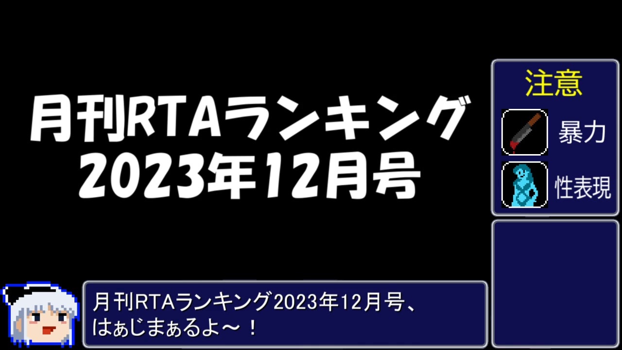 ランキングの集計方法について<br><a href="https://agfxrjlrprjoch6.hatenablog.com/entry/2021/10/17/170332" target="_blank" rel="noopener nofollow">https://agfxrjlrprjoch6.hatenablog.com/entry/2021/10/17/170332</a><br><br> 1位~100位<br><a href="https://rta-ranking-per-month.memo.wiki/d/2023%c7%af12%b7%ee%b9%e6" target="_blank" rel="noopener nofollow">https://rta-ranking-per-month.memo.wiki/d/2023%c7%af12%b7%ee%b9%e6</a> <br><br>この動画で利用している株式会社スクウェア・エニックスを代表とする共同著作者が権利を所有する著作物及びスギヤマ工房有限会社が権利を所有する楽曲の転載・配布は禁止いたします。<br>© 1990 ARMOR PROJECT/BIRD STUDIO/SPIKE CHUNSOFT/SQUARE ENIX All Rights Reserved.<br>© SUGIYAMA KOBO<br><br><a target="_blank" href="https://qa.nicovideo.jp/faq/show/19424?site_domain=default" style="font-size: 13px;color: #657586; text-decoration: underline; line-height: 1.4">この動画は投稿者によって修正されました</a>