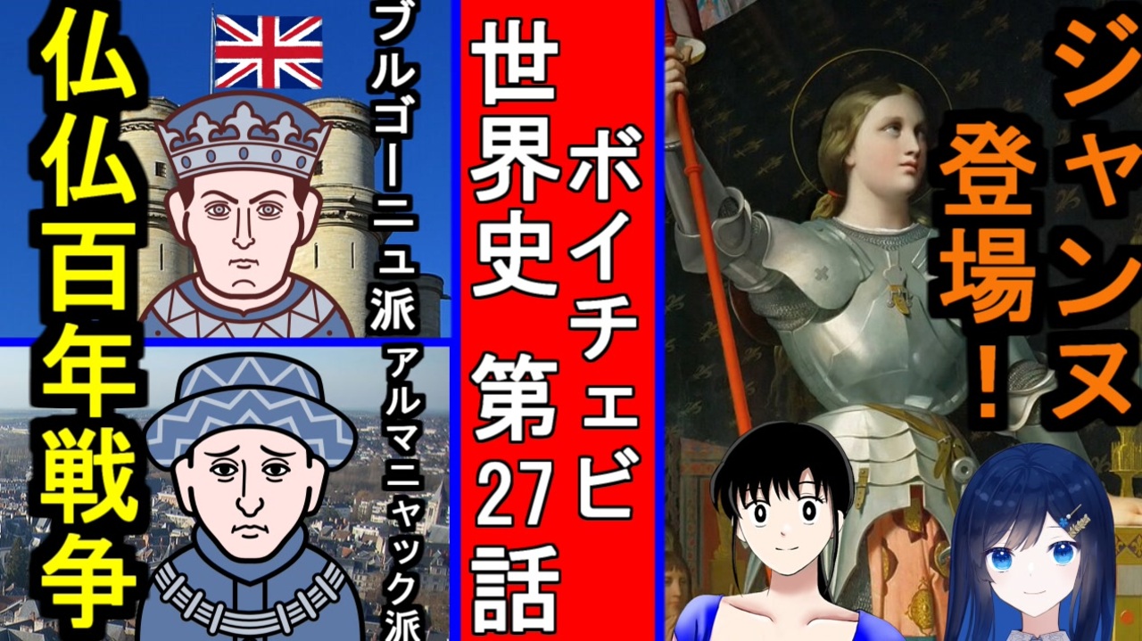 日テレ系「まんが日本史」をオマージュし、<br>学習漫画「世界の歴史」を教科書とした<br>ボイチェビ世界史 第27回は、<br>英仏百年戦争の続きと、<br><span style="font-size: 18px;"><strong>みんな大好き・ジャンヌ・ダルクです。</strong></span><br><br>「歴史学者・ことりさん」が、<br>no.7(voicevox)の声でご案内いたします。<br>そしてアシスタントに双葉湊音ちゃんを起用。<br><br>注意点<br>・セリフおよび画像は、その一部は教科書など参考文献から<br>引用させていただくことがあります。<br>・演出のために、舞台の時代にそぐわない画像や<br>音楽を使う場合がございます。<br>・セリフ発声はすべて合成音声<br>・BGMは、他者作成のBGMや音楽を借ります。<br>・若干の表記ゆれはご容赦ください。<br>・親作品は動画最後のスタッフロール画面に掲載します。<br><br>みどころ<br>2:01 【一部閲覧注意】フランスの一般市民の暴動!ジャックリーの乱<br><a href="https://www.nicovideo.jp/watch/sm44133826?from=121" target="_blank" rel="noopener nofollow">https://www.nicovideo.jp/watch/sm44133826?from=121</a><br><br>3:39 英国でも一般市民の暴動!ワットタイラーの乱<br><a href="https://www.nicovideo.jp/watch/sm44133826?from=219" target="_blank" rel="noopener nofollow">https://www.nicovideo.jp/watch/sm44133826?from=219</a><br><br>7:04 ジャンヌ・ダルク、大天使から啓示を受ける<br><a href="https://www.nicovideo.jp/watch/sm44133826?from=424" target="_blank" rel="noopener nofollow">https://www.nicovideo.jp/watch/sm44133826?from=424</a><br><br>8:59 ジャンヌ・ダルク、オルレアン包囲戦!<br>(BGM:ファイナルファンタジー4 ボス戦)<br><a href="https://www.nicovideo.jp/watch/sm44133826?from=539" target="_blank" rel="noopener nofollow">https://www.nicovideo.jp/watch/sm44133826?from=539</a><br><br>11:09 ジャンヌ・ダルク、宗教裁判にかけられ、火刑<br>(裁判官役・伊織弓鶴、BGM:FF2 脱出→DQ2 レクイエム)<br><a href="https://www.nicovideo.jp/watch/sm44133826?from=669" target="_blank" rel="noopener nofollow">https://www.nicovideo.jp/watch/sm44133826?from=669</a><br><br>18:49 ???<br><a href="https://www.nicovideo.jp/watch/sm44133826?from=1129" target="_blank" rel="noopener nofollow">https://www.nicovideo.jp/watch/sm44133826?from=1129</a><br><br><a target="_blank" href="https://qa.nicovideo.jp/faq/show/19424?site_domain=default" style="font-size: 13px;color: #657586; text-decoration: underline; line-height: 1.4">この動画は投稿者によって修正されました</a>