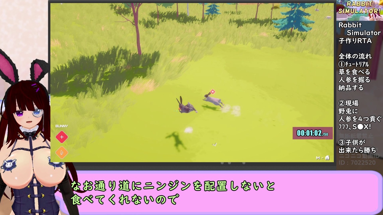 純愛チャートにより暫定1位記録 <br>追記:投稿20時間くらいでデバイス制限されました<br><br><br><strong><u>◆RTAレギュレーション◆<br>赤ちゃんうさぎを作る<br>AI WOLF(タイトル画面にあるやつ)をオンにしておく<br>計測区間:START押下~赤ちゃんうさぎが生まれるまで</u></strong><br>(先駆者様基準)<br><br>先駆者様の貝→<a href="https://www.nicovideo.jp/watch/sm44082359" class="watch">sm44082359</a><br>先駆者様の蟹→<a href="https://www.nicovideo.jp/watch/sm44139758" class="watch">sm44139758</a><br> <br>RTAマイリスト→<a href="https://www.nicovideo.jp/mylist/69428960" target="_blank" rel="noopener">mylist/69428960</a><br>普通の実況等のマイリスト→<a href="https://www.nicovideo.jp/mylist/73122841" target="_blank" rel="noopener">mylist/73122841</a><br><br>スピードラン提出用:タイマーのみの無編集版<br>→<a href="https://youtu.be/-RYwSj4TsKI?si=VEksRBq9ED3x-Nd3" target="_blank" rel="noopener nofollow">https://youtu.be/-RYwSj4TsKI?si=VEksRBq9ED3x-Nd3</a><br>(YouTubeです)<br><br>このゲームのSteamのURL<br><a href="https://store.steampowered.com/app/1257210/Rabbit_Simulator/?l=japanese" target="_blank" rel="noopener nofollow">https://store.steampowered.com/app/1257210/Rabbit_Simulator/?l=japanese</a><br><br>カスタムオーダーメイド3D2(COM3D2)及び<br>バーチャルアバタースタジオを使用しています。