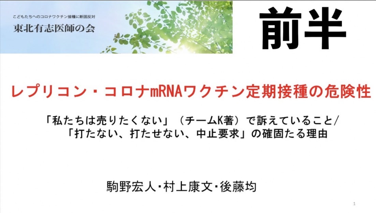 【前半】レプリコン、コロナmRNAワクチン定期接種の危険性<br>ー「私たちは売りたくない」(チームK著)で訴えていること「打たない、打たせない、中止要求」の確固たる理由ー<br><br>≪内容≫<br><br>①「私たちは売りたくない」(チームK著)を読んで思うこと<br>②レプリコンについて:一変承認資料、論文、審査報告書から判断できる危険性 <br><br>≪チャプター≫<br><br><a href="#" class="seekTime" data-seekTime="00:00" onclick="seekNicoPlayer('#00:00'); return false;">#00:00</a><br> 「私たちは売りたくない」(チームK著)を読んで思うこと<br><a href="#" class="seekTime" data-seekTime="09:43" onclick="seekNicoPlayer('#09:43'); return false;">#09:43</a><br> レプリコン*背景とレプリコンについて<br><a href="#" class="seekTime" data-seekTime="27:17" onclick="seekNicoPlayer('#27:17'); return false;">#27:17</a><br> レプリコン*レプリコンの問題点<br> 1)RNA複製を止める仕組みがない。RNA複製・スパイク産生はいつまで続くのか?<br><a href="#" class="seekTime" data-seekTime="43:55" onclick="seekNicoPlayer('#43:55'); return false;">#43:55</a><br> 2)RNA変異が伴う複製をする。→機能獲得実験となる。<br><a href="#" class="seekTime" data-seekTime="47:24" onclick="seekNicoPlayer('#47:24'); return false;">#47:24</a><br> 3)細胞間伝播の可能性が高い:類似例では証明されている。<br> 個体間に伝染するか?<br><a href="#" class="seekTime" data-seekTime="1:02" onclick="seekNicoPlayer('#1:02'); return false;">#1:02</a>:23<br> 一変承認の意味、危険性<br><br><br>≪出演≫<br><br>村上康文 東京理科大学 名誉教授 <a href="https://www.yasufumimurakami-official.com" target="_blank" rel="noopener nofollow">https://www.yasufumimurakami-official.com</a><br>後藤均(東北有志医師の会 代表)ごとう整形外科 手外科クリニック 院長 <a href="https://karyukai.jp" target="_blank" rel="noopener nofollow">https://karyukai.jp</a><br>駒野宏人(東北有志医師の会)薬学博士、認知症・神経科学専門 <a href="https://brainfitness-coaching.net" target="_blank" rel="noopener nofollow">https://brainfitness-coaching.net</a><br>