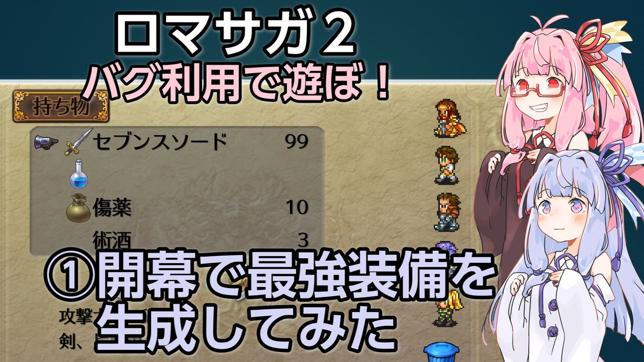1か月後(投稿時点)に迫ったロマンシング サガ2 リベンジオブザセブンの発売を応援するため、久しぶりに動画を作ってみました。<br>おそらく3話(+1おまけ?)で完結予定です。<br>楽しんでもらえたらうれしいです。<br><br>シリーズの内容としては、まっとうな攻略ではなく、<br>・アイテム生成などのバグ技紹介<br>・リマスターの追加要素紹介<br>というものを予定しております。<br>リベンジオブザセブンの発売前に実際にプレイしなおしたり、内容を思い返したりするときに、こちらの動画を利用してもらえたらとてもうれしいです<br>そしてみんなでロマサガ2Rの発売を楽しみましょうぜ!<br><br>←前:なし(※)<br>→次:<a href="https://www.nicovideo.jp/watch/sm44188360" class="watch">sm44188360</a><br><br>※:<a href="https://www.nicovideo.jp/watch/sm44124513" class="watch">sm44124513</a>は1話の前半としてあげていた動画ですが、<br> 予定を改め、1話で1本にまとめなおしたためお蔵入りにしております<br><br>連絡先:<a href="https://x.com/HinatamaCH" target="_blank" rel="noopener nofollow">https://x.com/HinatamaCH</a><br><br>お世話になった作者様・作品たち<br>動画で紹介している技は私が発見したものではなく、偉大な先人たちが編み出していったものであります。<br>なので、この動画が面白かったら、以下の動画をぜひともご覧いただけるとうれしいです!<br>パルポロ様<br>(タップバグ)<a href="https://www.nicovideo.jp/watch/sm40417264" target="_blank" rel="noopener nofollow">https://www.nicovideo.jp/watch/sm40417264</a><br>(RTA)<a href="https://www.nicovideo.jp/watch/sm44014929" target="_blank" rel="noopener nofollow">https://www.nicovideo.jp/watch/sm44014929</a><br>おやつ様<br><a href="https://www.nicovideo.jp/watch/sm43903270" target="_blank" rel="noopener nofollow">https://www.nicovideo.jp/watch/sm43903270</a><br>HAKUA(白鴉)様<br><a href="https://www.nicovideo.jp/watch/sm44021000" target="_blank" rel="noopener nofollow">https://www.nicovideo.jp/watch/sm44021000</a><br><br>素敵な立ち絵:のくな△様<br><a href="https://seiga.nicovideo.jp/user/illust/28390698" target="_blank" rel="noopener nofollow">https://seiga.nicovideo.jp/user/illust/28390698</a><br>みんな大好きカエル研究室様<br><a href="http://kaerulabo.web.fc2.com/rs2/index.htm" target="_blank" rel="noopener nofollow">http://kaerulabo.web.fc2.com/rs2/index.htm</a><br><br><br>© SQUARE ENIX<br>Planned & Developed by ArtePiazza<br>ILLUSTRATION:TOMOMI KOBAYASHI<br>CG Illustration : ArtePiazza<br>当該作品の転載・配布は禁止いたします。<br>