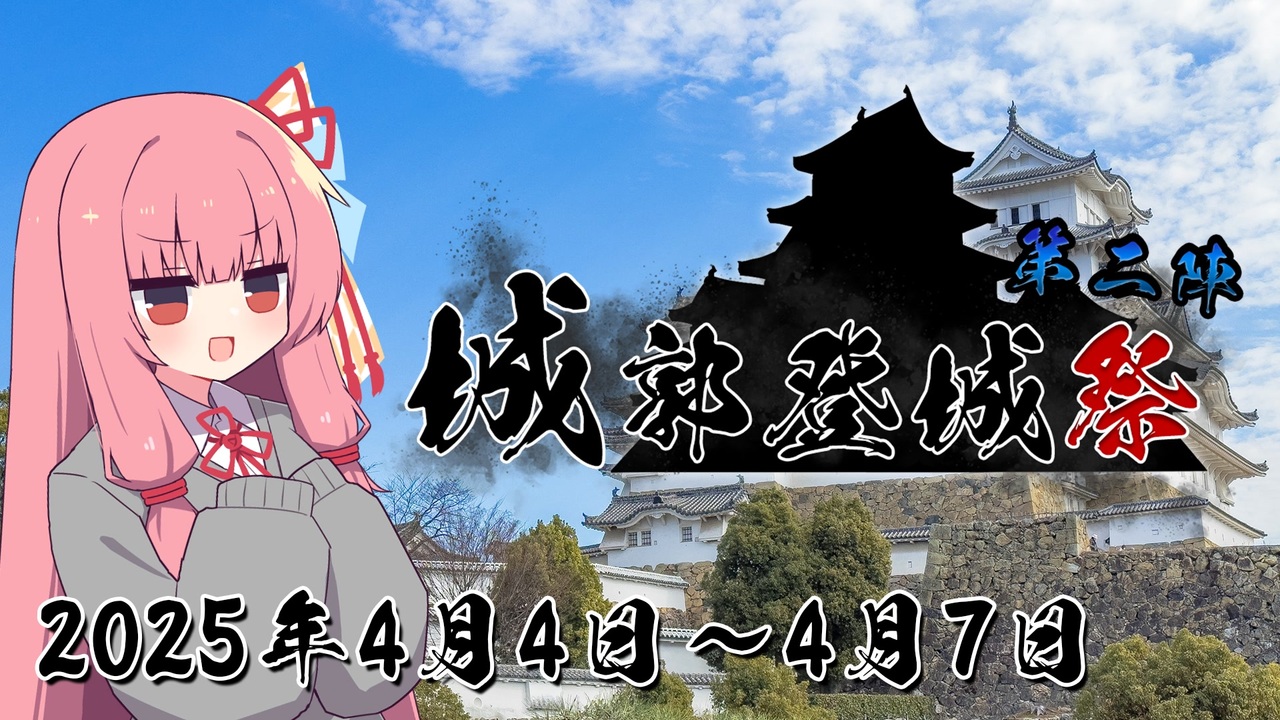 <span style="color: #cc0000; font-size: 18px;"><strong>城郭登城祭やるぞー!</strong></span><br><br>質問返答動画→<a href="https://www.nicovideo.jp/watch/sm44419625" class="watch">sm44419625</a><br><br>◆<strong>開催期間:</strong><br>2025年4月4日(金) 0:00 ~ 4月7日(月) 23:59<br><br><strong>◆レギュレーション:</strong><br>・国内・海外問わずお城巡りの動画であること。<br>・訪れたお城の(簡単な)解説要素を入れる 。<br>・ソフトウェアトーク(歌唱ソフト可)を使用すること。<br>・訪れたお城の名前と県名(海外であれば国名)を、動画説明欄に記載。(強制ではありません)<br><br>詳細は動画をご確認ください!<br><br>旅行祭としてゆる~い感じを想定してるので、お城が分からなくてもお気軽にご参加ください!<br>被りは気にせず、主催の動画や、前回の祭り動画の追走でも大歓迎です!<br><br>◆ロゴ<br>・城郭登城祭第二陣ロゴ_黒:<a href="https://seiga.nicovideo.jp/seiga/im11488226" target="_blank" rel="noopener">im11488226</a><br>・城郭登城祭第二陣ロゴ_白:<a href="https://seiga.nicovideo.jp/seiga/im11488227" target="_blank" rel="noopener">im11488227</a><br><br>◆100名城 &続100名城 (+α)にピン立てしたmap<br><a href="https://www.google.com/maps/d/u/0/edit?mid=1L0SWHUF2rpWhJdyoA_kQl79OsaZHxbM" target="_blank" rel="noopener nofollow">https://www.google.com/maps/d/u/0/edit?mid=1L0SWHUF2rpWhJdyoA_kQl79OsaZHxbM</a><br><br>◆前回の城郭登城祭で皆様が訪れたお城にピン立てしたmap(ニコニコ153名城)<br><a href="https://www.google.com/maps/d/edit?mid=1PtR3OU3kXoBgv4oHFwo1T169SymZaj8" target="_blank" rel="noopener nofollow">https://www.google.com/maps/d/edit?mid=1PtR3OU3kXoBgv4oHFwo1T169SymZaj8</a><br><br>◆質問返答<br>・安土城(伊賀のアレ),小坂城:ネタ的に好きです。ネタ潰しを避ける為、あえて多くは語りませんが天守(海外の城でいうキープも可)や宮殿を模した建物など、お城要素があれば本投稿祭で(ネタ枠として)城と言い張ってOKです<br>・ボイチェン→ OKとします(SeirenVoice,Paravo等)<br>・城プラモ、ジオラマ→現地に赴いて実物のお城との比較動画ならOK. 作るだけの動画はNGです。<br>・マジンガー→城として実際に巡れる施設があるならばどうぞ。レギュと趣旨は忘れないでくださいね。<br /><br><span style="color: #cc4125; font-size: 24px;"><strong>城郭登城祭第三陣やるよ~! みんなお城行こうね!</strong></span><br>詳しくは下記の告知動画を観てね!<br>◆開催期間:<br>2026年4月4日(土) 0:00 ~ 4月12日(日) 23:59<br><br>◆告知動画:<br><a href="https://www.nicovideo.jp/watch/sm45392440" class="watch">sm45392440</a><br><br>《城郭登城祭第二陣(2025)の参加動画》<br><a href="https://www.nicovideo.jp/mylist/77145802" target="_blank" rel="noopener">mylist/77145802</a><br><br>《琴葉姉妹のお城さんぽ》<br><a href="https://www.nicovideo.jp/series/332352" target="_blank" rel="noopener">series/332352</a><br><br>《お城の初心者解説動画のような何か》<br><a href="https://www.nicovideo.jp/series/485578" target="_blank" rel="noopener">series/485578</a><br><br>いつもコメントやいいね、広告等で応援いただきありがとうございます!物凄く励みになってます!<br>良ければ気軽にフォローとか反応頂けたら嬉しみです~( ˘ω˘)<br><br>中の人のあれこれ(lit link)→ <a href="https://lit.link/yunominochashibu" target="_blank" rel="noopener nofollow">https://lit.link/yunominochashibu</a><br><br><a target="_blank" href="https://qa.nicovideo.jp/faq/show/19424?site_domain=default" style="font-size: 13px;color: #657586; text-decoration: underline; line-height: 1.4">この動画は投稿者によって修正されました</a>