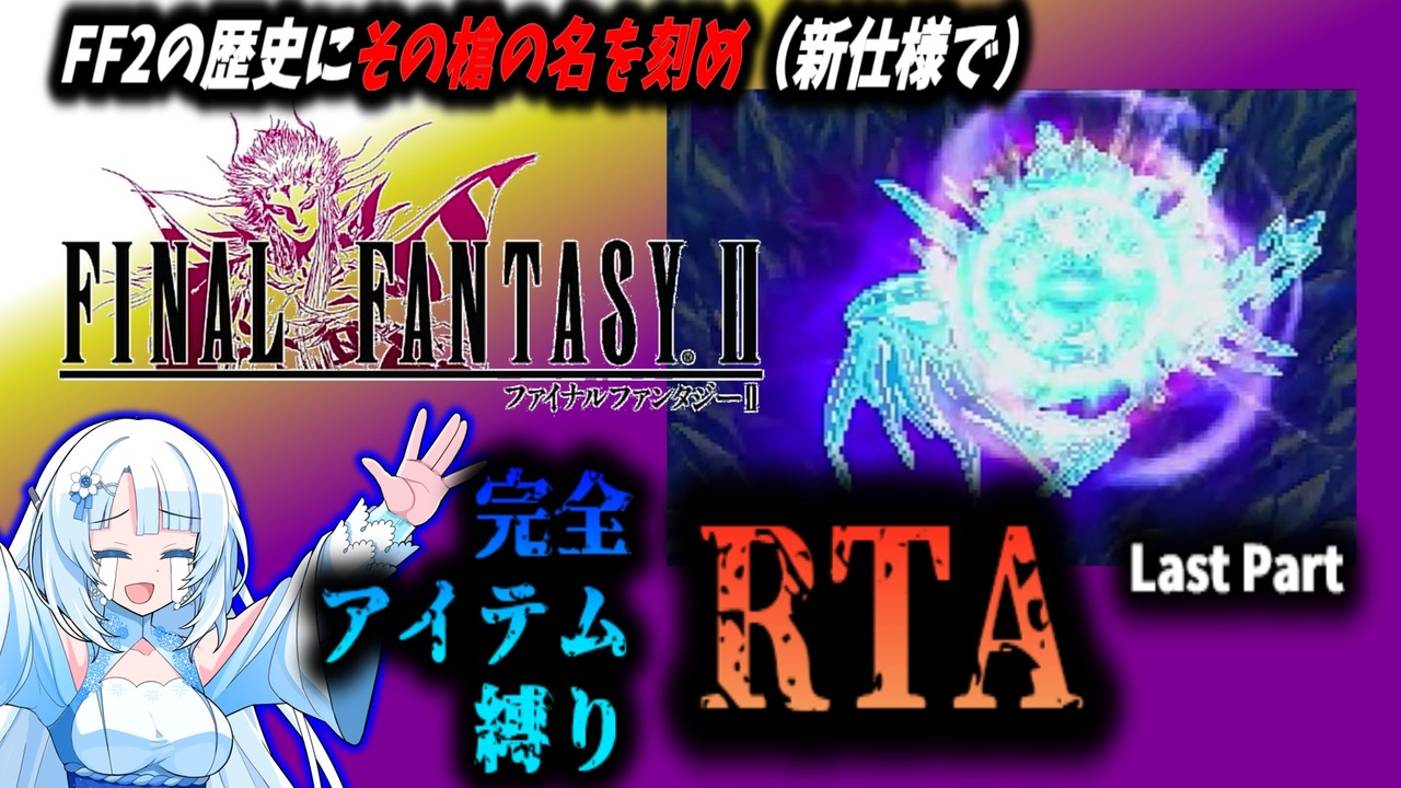 ピクセルリマスター版FF2(Switch版)を以下の条件でRTAしました。<br><br>・戦闘中に許可するコマンドは「アイテム」「ぼうぎょ」のみ<br>・移動中の魔法利用禁止<br>・操作ガバ等で縛り違反をした場合は、すぐに直前のセーブデータからやり直す<br>・ブースト機能の利用を一部許可(エンカウントOFF・獲得ギル4倍を利用)<br>・計測区間は名前を決定してから、ウボァーのセリフが表示された瞬間まで<br>・苦行はしない<br><br>まるで成長しないFF2RTAと平行して投稿しています。→<a href="https://www.nicovideo.jp/series/474962" target="_blank" rel="noopener">series/474962</a><br>VOICEVOX:WhiteCUL<br><br>参考サイト……<br>ファイナルファンタジー用語辞典:<a href="https://wikiwiki.jp/ffdic" target="_blank" rel="noopener nofollow">https://wikiwiki.jp/ffdic</a><br>GCGX(ゲーム攻略・解析&ホームページ作成):<a href="https://gcgx.games/" target="_blank" rel="noopener nofollow">https://gcgx.games/</a><br>FF2よ永遠なれ:<a href="https://surume5.han-be.com/Home/FF2/index.htm" target="_blank" rel="noopener nofollow">https://surume5.han-be.com/Home/FF2/index.htm</a><br>Gamer Corner Guides:<a href="https://guides.gamercorner.net/" target="_blank" rel="noopener nofollow">https://guides.gamercorner.net/</a><br>はたぼーの部屋:<a href="https://hboh2511.web.fc2.com/" target="_blank" rel="noopener nofollow">https://hboh2511.web.fc2.com/</a><br>cheapなゲーム攻略情報:<a href="http://www.ric.hi-ho.ne.jp/cheap_restaurant/GAME/" target="_blank" rel="noopener nofollow">http://www.ric.hi-ho.ne.jp/cheap_restaurant/GAME/</a><br>まるで成長しないFF2_RTA エンカOFF・ギル/熟練度/能力値0倍縛り:<a href="https://www.nicovideo.jp/series/459507" target="_blank" rel="noopener">series/459507</a><br><br>Part5→<a href="https://www.nicovideo.jp/watch/sm44097538" class="watch">sm44097538</a><br><br>© SQUARE ENIX<br>LOGO ILLUSTRATION:© YOSHITAKA AMANO<br>「記載されている会社名・製品名・システム名などは、各社の商標、または登録商標です。」<br><br><a target="_blank" href="https://qa.nicovideo.jp/faq/show/19424?site_domain=default" style="font-size: 13px;color: #657586; text-decoration: underline; line-height: 1.4">この動画は投稿者によって修正されました</a>