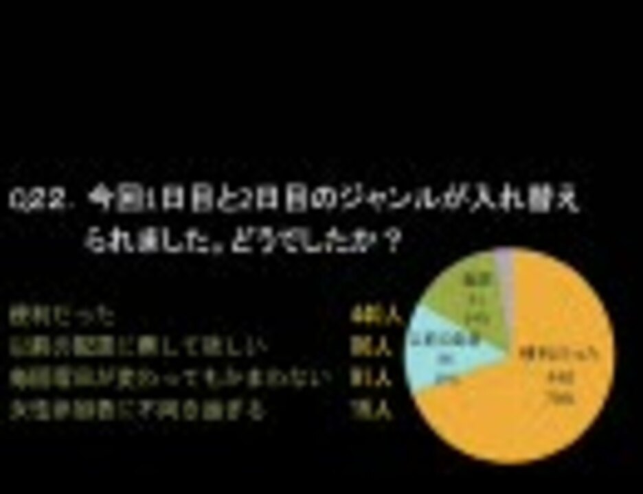 コミックマーケット74終了後に行ったアンケートの結果です<br /><br /><font color="#ff0000"><font size="+2">この動画は後編です。前編をご覧になってない方は前編からご覧ください→<a href="https://www.nicovideo.jp/watch/sm4415644" class="watch">sm4415644</a><br /><br /></font></font>音楽は以下のところからお借りしました。ありがとうございます。<br />エアーマンが倒せないEuroMix→<a href="https://www.nicovideo.jp/watch/sm4005132" class="watch">sm4005132</a> IevanPolkka→ミク<a href="https://www.nicovideo.jp/watch/sm982882" class="watch">sm982882</a> ボーカロイド合唱<a href="https://www.nicovideo.jp/watch/sm2090579" class="watch">sm2090579</a><br /><br /><br />うp主が今までうpしてきた動画→<a href="https://www.nicovideo.jp/mylist/14427215" target="_blank" rel="noopener">mylist/14427215</a></font>
