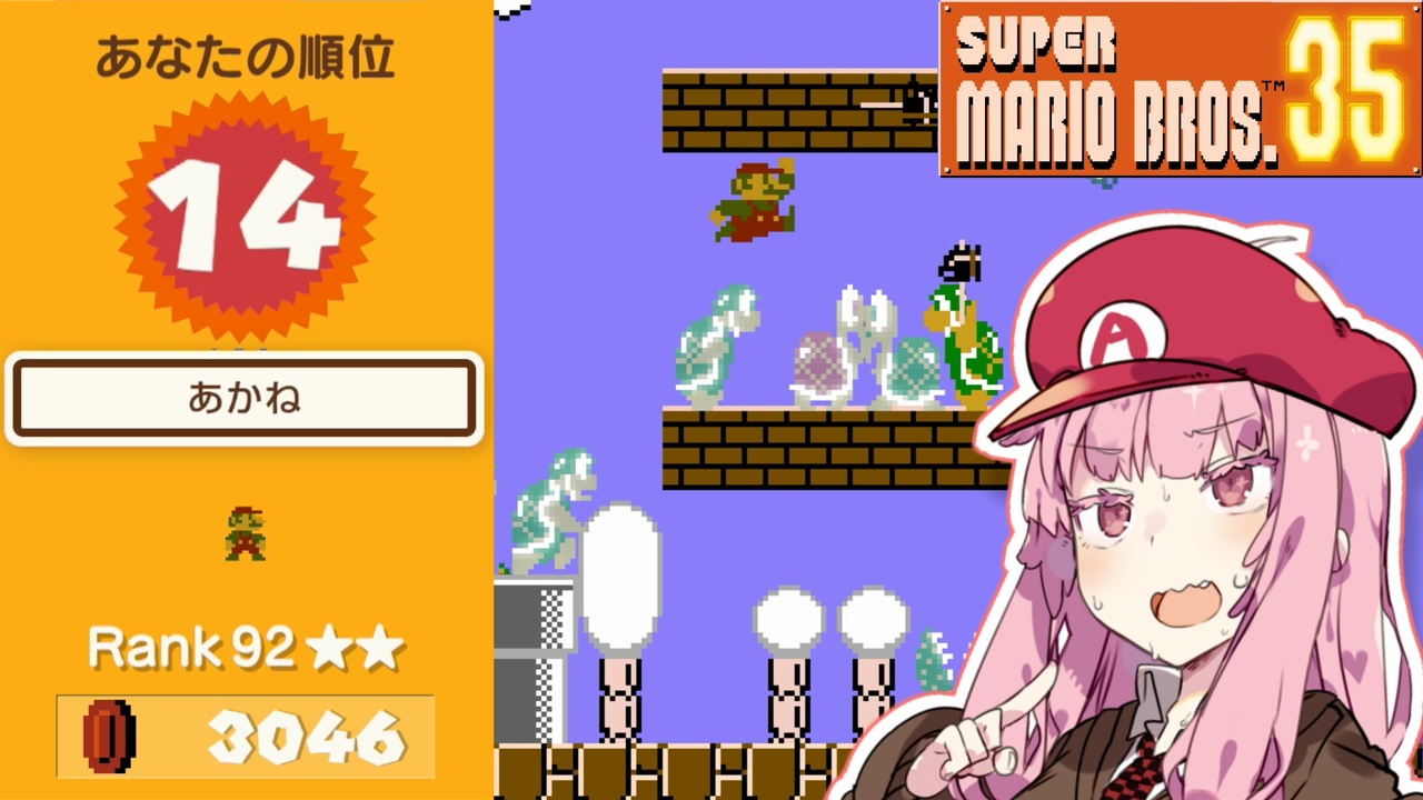 マリオ35が4周年を迎えたので初投稿です。<br><br>あと1年でマリオ40周年というわずかな期待だけが茜ちゃんを救う唯一の道ですが茜ちゃんが完全復活するコンテンツが来る可能性は……<br><br><br><br><br>今回のステージ順を載せておきます<br>7-1→5-2→5-1→6-3→5-3→8-3→3-4→ループ<br><br><br><br>いいねを押すとマリオ35の豆知識が見れます<br><br><br><br>前:<a href="https://www.nicovideo.jp/watch/sm43675105" class="watch">sm43675105</a> 次:マリオ35から逃げるな<br><br>マリオ35のマイリスト:<a href="https://www.nicovideo.jp/mylist/71006335" target="_blank" rel="noopener">mylist/71006335</a><br>今まで作った動画:<a href="https://www.nicovideo.jp/mylist/60661860" target="_blank" rel="noopener">mylist/60661860</a><br><br><br><br>ランキング情報があればこちらに<br><a href="https://docs.google.com/forms/d/1NAvEizaKkYZRpIqTgMRjTxqKk0pApei5Hf01AV0Xjmg/edit" target="_blank" rel="noopener nofollow">https://docs.google.com/forms/d/1NAvEizaKkYZRpIqTgMRjTxqKk0pApei5Hf01AV0Xjmg/edit</a><br><br><span style="font-size: 18px;"><strong>他マリオ35関連動画↓</strong></span><br><br>メインメニューBGMのボイパロイド → <a href="https://www.nicovideo.jp/watch/sm40586777" class="watch">sm40586777</a><br>原作再現ステージのR.T.A動画 → <a href="https://www.nicovideo.jp/watch/sm40255591" class="watch">sm40255591</a><br>禁じられたゲーム(マリオ35)の音MAD:<a href="https://www.nicovideo.jp/watch/sm40555794" class="watch">sm40555794</a><br>ジェネリックマリオ35(マリメ2) → <a href="https://www.nicovideo.jp/mylist/72532086" target="_blank" rel="noopener">mylist/72532086</a>