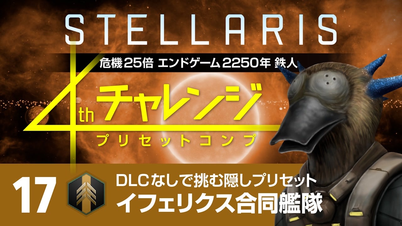 プリセット帝国で危機25倍エンドゲーム2250年鉄人モードに挑むシリーズのハイライト編集版です。<br>「いいね」にこのプリセット帝国のおすすめ度を入れています。<br><br>☆参考動画<br>【Stellaris】XT-223と考える艦船設計 part1 - ハチマキさん<br><a href="https://www.nicovideo.jp/watch/sm43504342" target="_blank" rel="noopener nofollow">https://www.nicovideo.jp/watch/sm43504342</a><br><br>【Stellaris1分動画祭】Stellarisで最も影が薄い(?)プリセット帝国 - 古郡 さん<br><a href="https://www.nicovideo.jp/watch/sm43667920" target="_blank" rel="noopener nofollow">https://www.nicovideo.jp/watch/sm43667920</a><br><br>☆Paradoxロゴと社名の由来<br><a href="https://forum.paradoxplaza.com/forum/threads/paradox-interactive-logo-origin.804525/#post-18155805" target="_blank" rel="noopener nofollow">https://forum.paradoxplaza.com/forum/threads/paradox-interactive-logo-origin.804525/#post-18155805</a><br><br>☆無編集版<br><a href="https://www.youtube.com/playlist?list=PLKTCcuX4WBFlJ5d-Il4m6KEXQzceDphEs" target="_blank" rel="noopener nofollow">https://www.youtube.com/playlist?list=PLKTCcuX4WBFlJ5d-Il4m6KEXQzceDphEs</a><br><br>☆チャレンジの詳細(予告編)<br><a href="https://www.nicovideo.jp/watch/sm39832845" class="watch">sm39832845</a><br><br>☆ゲーム<br>・Stellaris v3.13<br><br>☆設定<br>・危機25倍<br>・ミッドゲーム2225年<br>・エンドゲーム2250年<br>・難易度 元帥<br>・鉄人モード<br>・その他はデフォルト<br><br>☆DLC<br>・なし<br><br>☆MOD<br>・Full Tiny Outliner<br>・Improved Topbar - Extended<br>・Tech Tiers Revealed<br><br>☆ナレーション<br>四国めたん(VOICEVOX)<br><br /><br><span style="color: #262626;">1stチャレンジ(国際地球連合編)⇒ </span><span style="color: #0000ff;"><a href="https://www.nicovideo.jp/series/157544" target="_blank" rel="noopener">series/157544</a></span><br><span style="color: #262626;">2ndチャレンジ(人類共同体編)⇒ </span><span style="color: #0000ff;"><a href="https://www.nicovideo.jp/series/182469" target="_blank" rel="noopener">series/182469</a></span><br><span style="color: #262626;">3rdチャレンジ(ロク機械主義国編)⇒ </span><span style="color: #0000ff;"><a href="https://www.nicovideo.jp/series/207056" target="_blank" rel="noopener">series/207056</a></span><br><span style="color: #262626;">4thチャレンジ(プリセットコンプ)⇒ </span><span style="color: #0000ff;"><a href="https://www.nicovideo.jp/series/287612" target="_blank" rel="noopener">series/287612</a></span><br><span style="color: #262626;">Stellarisマルチプレイ ⇒ </span><span style="color: #0000ff;"><a href="https://www.nicovideo.jp/series/367123" target="_blank" rel="noopener">series/367123</a></span><br><span style="color: #262626;">Stellaris検証動画 ⇒ </span><span style="color: #0000ff;"><a href="https://www.nicovideo.jp/series/202576" target="_blank" rel="noopener">series/202576</a></span><br><span style="color: #262626;">Stellaris妄想動画 ⇒ </span><span style="color: #0000ff;"><a href="https://www.nicovideo.jp/series/310298" target="_blank" rel="noopener">series/310298</a></span><br>Stellaris1分動画祭 ⇒ <a href="https://www.nicovideo.jp/series/404730" target="_blank" rel="noopener">series/404730</a><br><br><br><a target="_blank" href="https://qa.nicovideo.jp/faq/show/19424?site_domain=default" style="font-size: 13px;color: #657586; text-decoration: underline; line-height: 1.4">この動画は投稿者によって修正されました</a>