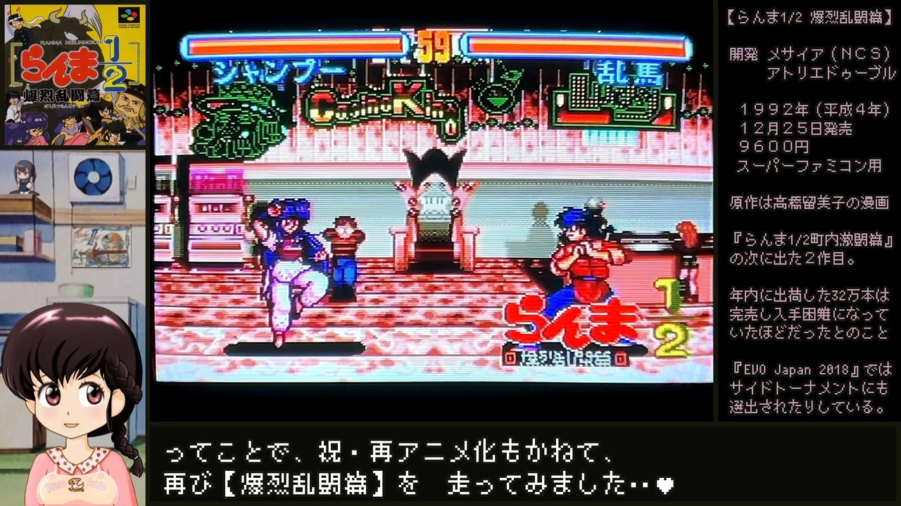 祝・再アニメ化も兼ねて再び走ってみたら...(*˘ω˘)ポッ<br> <br> <br><strong>//計測区間</strong><br>キャラクター選択直後~ラスボス撃破後の勝利ポーズ時点まで(Speedrun.com 準拠)<br><a href="https://www.speedrun.com/ranma__hard_battle" target="_blank" rel="noopener nofollow">https://www.speedrun.com/ranma__hard_battle</a><br><br><strong>//備考 </strong><br>【ブラウン管テレビ】でのファミコンの映像を動画で綺麗に遺せないかな~って画策している動画だったりもします...(*˘ω˘)φ_<br>(※1080pでの視聴を前提にしてるので【1920x1080】未満のサイズだとモアレが酷くなる可能性がありまぁす)<br> <br><strong>//参考文献</strong> <br>らんま½ <a href="https://amzn.to/3zMlgEq" target="_blank" rel="noopener nofollow">https://amzn.to/3zMlgEq</a> <br>らんま½(原作) <a href="https://www.sunday-webry.com/episode/2550912964676980735" target="_blank" rel="noopener nofollow">https://www.sunday-webry.com/episode/2550912964676980735</a> (4話以降はアプリのみ)<br>めぞん一刻 <a href="https://amzn.to/3ojH2WC" target="_blank" rel="noopener nofollow">https://amzn.to/3ojH2WC</a><br><br /> <br><br><span style="color: #e69138;">//共通説明文てすと</span><br><span style="color: #ff00ff;"><strong>【New!】</strong></span>F-ZERO RTA:<a href="https://www.nicovideo.jp/watch/sm45660939" class="watch">sm45660939</a><br>【New!】Romancing Sa・Ga2:<a href="https://www.nicovideo.jp/watch/sm44400984" class="watch">sm44400984</a> <br>【New!】らんま½爆烈乱闘篇RTA (WR):<a href="https://www.nicovideo.jp/watch/sm44178414" class="watch">sm44178414</a>(デバイス制限対策版: <a href="https://www.nicovideo.jp/watch/sm44432134" class="watch">sm44432134</a>)<br>【New!】スーパーファミスタRTA:<a href="https://www.nicovideo.jp/watch/sm43890432" class="watch">sm43890432</a><br>【New!】ファミコンRTA落とし穴可視化用アイコン:<a href="https://seiga.nicovideo.jp/seiga/im11438499" target="_blank" rel="noopener">im11438499</a>(←5月23日以降に投稿したのは消えちゃったぽい...?)<br><br>【直撮り】ブラウン管テレビでファミコンする管理人さん:<a href="https://www.nicovideo.jp/series/423780" target="_blank" rel="noopener">series/423780</a><br>【ミンサガ】RTAとか:<a href="https://www.nicovideo.jp/series/416017" target="_blank" rel="noopener">series/416017</a><br>【WS版FF2】RTA:<a href="https://www.nicovideo.jp/series/426767" target="_blank" rel="noopener">series/426767</a><br>【DEAD OR ALIVE】RTA:<a href="https://www.nicovideo.jp/series/79228" target="_blank" rel="noopener">series/79228</a><br>【バブルボブル】RTA:<a href="https://www.nicovideo.jp/series/366167" target="_blank" rel="noopener">series/366167</a><br><span style="font-size: 14px;">【アーケードアーカイブス】</span>RTA:<a href="https://www.nicovideo.jp/series/79229" target="_blank" rel="noopener">series/79229</a>