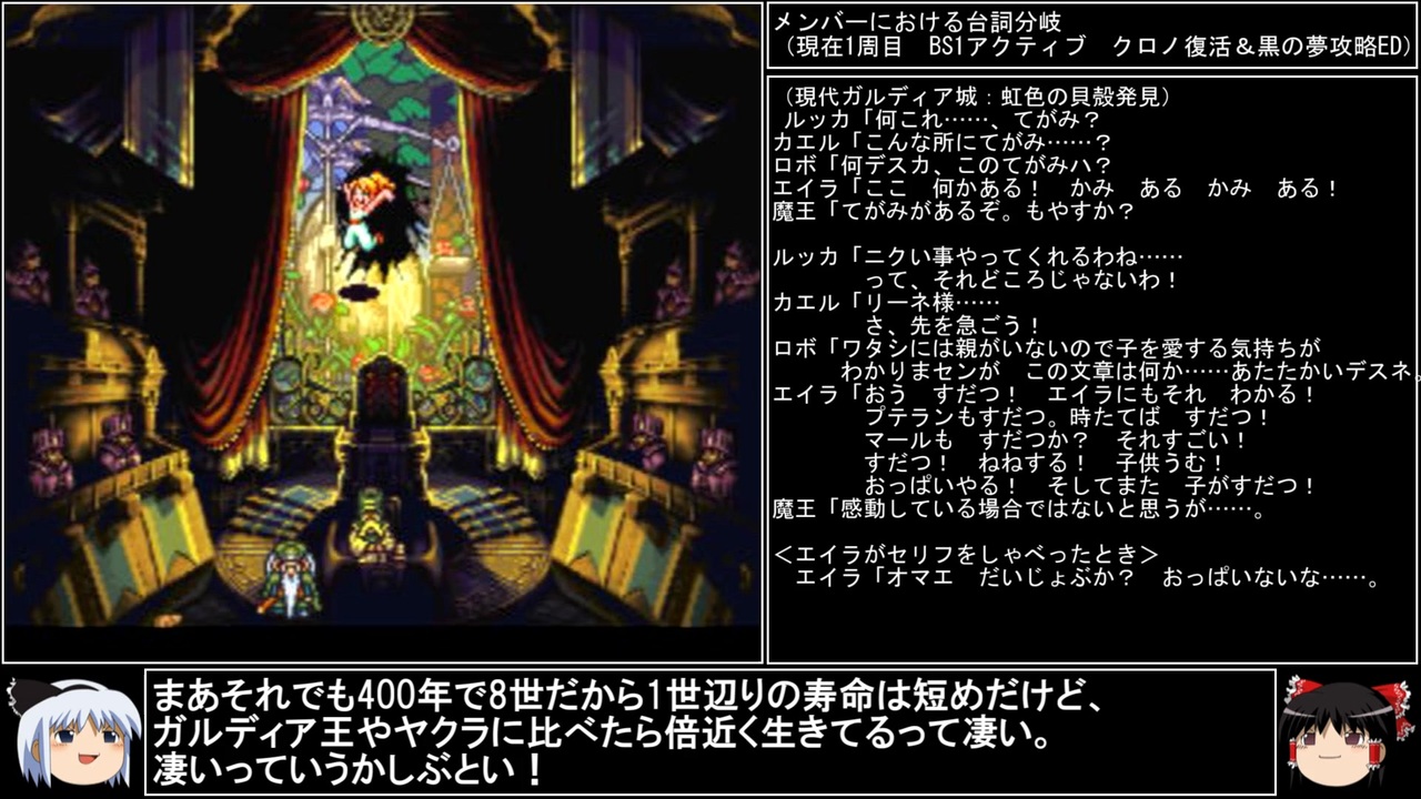 サブイベント編もラストです。<br>最後のガラスをぶち破ってダイナミック入廷します。<br><br><br>マニアしか知らない豆知識 スペッキオ編→<a href="https://www.nicovideo.jp/watch/sm44166310" class="watch">sm44166310</a><br>前→<a href="https://www.nicovideo.jp/watch/sm44153101" class="watch">sm44153101</a><br>次→<a href="https://www.nicovideo.jp/watch/sm44202503" class="watch">sm44202503</a><br><br>YouTube版→<a href="https://youtu.be/LMBzGRx-0Sg" target="_blank" rel="noopener nofollow">https://youtu.be/LMBzGRx-0Sg</a><br><br>縛りルール<br>①一度使った武器・防具・アクセサリー・道具・技・連携は<br> 次周回以降使用禁止(売却も解禁扱い)<br><br>②一度戦った敵シンボルとの再戦禁止。<br><br>③初戦闘の敵からの逃走禁止。<br><br>④裏技、バグ技、状況再現禁止。<br><br>⑤BS1アクティブからBS8ウェイトまで<br> 全てのバトルスピードとバトルモードで攻略する。<br><br>⑥各周回において見る予定のED条件を<br> 満たした段階で即ラヴォスと戦いに行く。<br><br>※ネタバレ注意です<br><br>このページ、動画で利用している弊社または弊社のライセンサーが権利を有する著作物の転載・配布は禁止いたします。<br>© 1995, 2018 SQUARE ENIX<br>Illustration: © 1995 BIRD STUDIO / SHUEISHA<br>Story and Screenplay: © 1995, 2008 ARMOR PROJECT / SQUARE ENIX<br><br>AquesTalk2ライセンスID:AQTK2WINUSR23122185<br /><br><br>❤いいねを押していただけるとモチベーションと投稿速度が上がるので宜しくお願い致します!<br><br>作者ツイッター→ <a href="https://twitter.com/nig0117" target="_blank" rel="noopener nofollow">https://twitter.com/nig0117</a><br>PIXIV FANBOX→ <a href="https://sutanokeiji.fanbox.cc/" target="_blank" rel="noopener nofollow">https://sutanokeiji.fanbox.cc/</a><br><br>( 以前はWEB小説書いてました→ <a href="https://kakuyomu.jp/works/1177354054884910267" target="_blank" rel="noopener nofollow">https://kakuyomu.jp/works/1177354054884910267</a> )