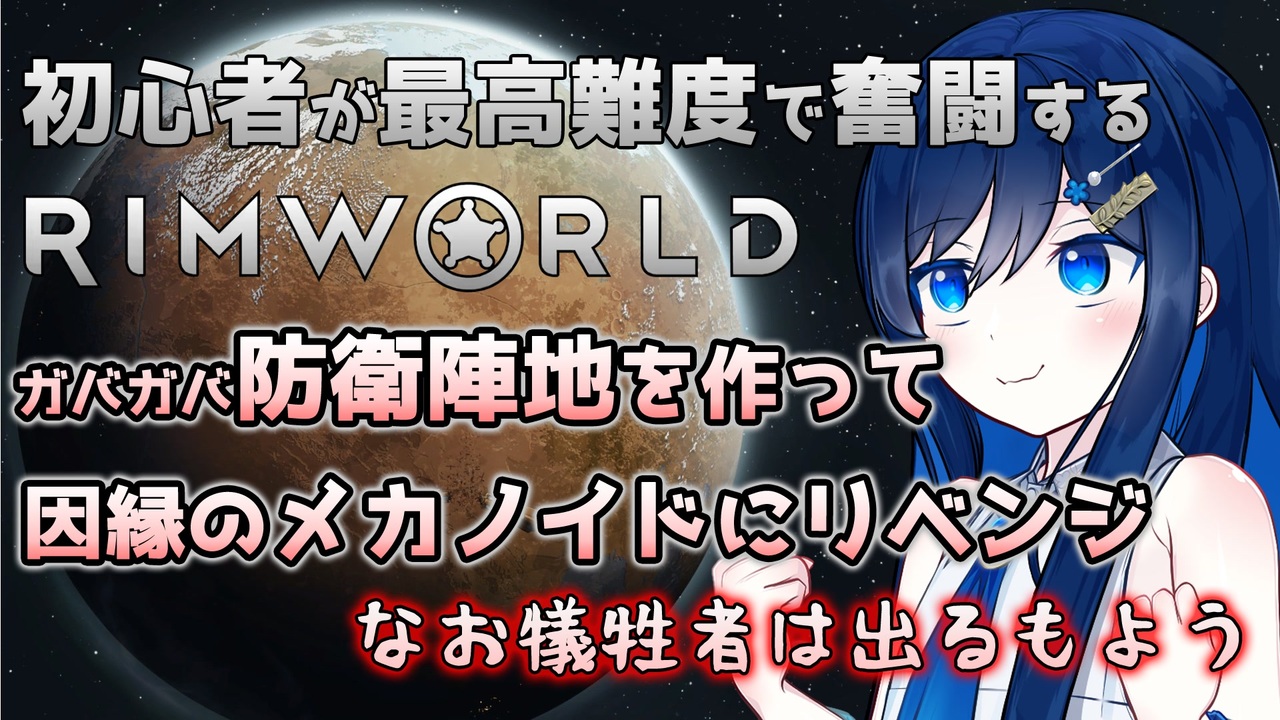先日今更ながらRimWorldを買ったので、最高難度・コミットメントモードで双葉ちゃんに酷い目に遭って貰うことにしました。<br>初心者プレイを楽しめるのは今だけだからね仕方ないね。<br><br>■ルール<br>・バージョン1.5/DLCなし<br>・勝ち目のない楽しさ <br>・コミットメント(パーマデス)モード<br>・双葉湊音orこみなとが死亡したら最初からやり直し<br>・プレイヤーは生存奮闘である程度生き残れる程度(初見ではないが研究炉は未経験)<br><br>■素材<br>・ボイス<br> CeVIO AI 双葉湊音 <a href="https://www.futabaminato.com/" target="_blank" rel="noopener nofollow">https://www.futabaminato.com/</a><br> 謎の声 VOICEVOX Nemo 男声2、女声6<br>・立ち絵<br> 小さめ双葉湊音立ち絵 <a href="https://seiga.nicovideo.jp/seiga/im11333877" target="_blank" rel="noopener nofollow">https://seiga.nicovideo.jp/seiga/im11333877</a><br> 立ちふたばこみなと素材 <a href="https://seiga.nicovideo.jp/seiga/im11460546" target="_blank" rel="noopener nofollow">https://seiga.nicovideo.jp/seiga/im11460546</a><br>・音楽<br> PeriTune <a href="https://peritune.com/" target="_blank" rel="noopener nofollow">https://peritune.com/</a>