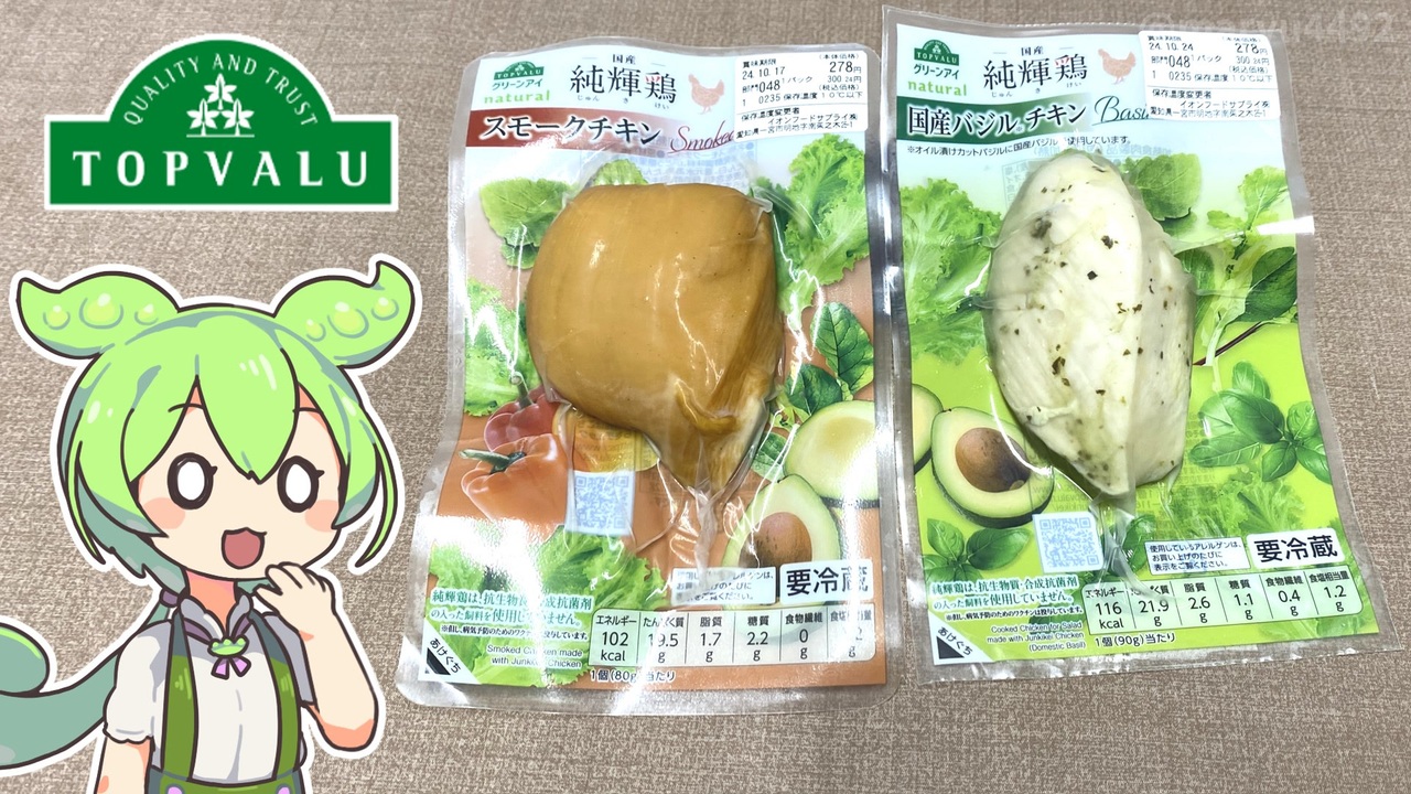 トップバリュのブランド鶏「純輝鶏(ジュンキケイ)」を使った<br>サラダチキンっぽいやつです。<br><br><br>【関連動画】 <br>トップバリュのオリジナルブランド純輝鶏(ジュンキケイ)で作る「骨付鳥」2023.08.11<br><a href="https://www.nicovideo.jp/watch/sm42587731" target="_blank" rel="noopener nofollow">https://www.nicovideo.jp/watch/sm42587731</a><br><br><br> 【参考】 <br>国産純輝鶏 国産バジルチキン(トップバリュ)<br> <a href="https://www.topvalu.net/items/detail/4549414623543/" target="_blank" rel="noopener nofollow">https://www.topvalu.net/items/detail/4549414623543/</a><br> 国産純輝鶏 スモークチキン(トップバリュ)<br> <a href="https://www.topvalu.net/items/detail/4549414623574/" target="_blank" rel="noopener nofollow">https://www.topvalu.net/items/detail/4549414623574/</a> <br>国産純輝鶏(トップバリュ) <br><a href="https://www.topvalu.net/junkikei/" target="_blank" rel="noopener nofollow">https://www.topvalu.net/junkikei/</a> <br>トップバリュグリーンアイ(トップバリュ)<br> <a href="https://www.topvalu.net/gurinai/" target="_blank" rel="noopener nofollow">https://www.topvalu.net/gurinai/</a> <br>フルタフーズ・昔亭<br> <a href="https://sekitei-furuta.co.jp/" target="_blank" rel="noopener nofollow">https://sekitei-furuta.co.jp/</a> <br>「こんなうまい金儲けの話はない」と社員に話す <br>コロナ補助金不正受給初公判 被告は起訴内容を認める 富山2023.01.30(TBS NEWS DIG) <a href="https://newsdig.tbs.co.jp/articles/-/302093?display=1" target="_blank" rel="noopener nofollow">https://newsdig.tbs.co.jp/articles/-/302093?display=1</a> <br>プライフーズ株式会社 <br><a href="https://www.prifoods.jp/" target="_blank" rel="noopener nofollow">https://www.prifoods.jp/</a> <br>刃物祭(岐阜県関市)<br> <a href="https://seki-hamono.jp/" target="_blank" rel="noopener nofollow">https://seki-hamono.jp/</a><br><br>【使用した素材】(※敬称略) <br>(合成音声)VOICEVOX/ずんだもん/四国めたん<br> <a href="https://voicevox.hiroshiba.jp/" target="_blank" rel="noopener nofollow">https://voicevox.hiroshiba.jp/</a> <br>(立ち絵)坂本アヒル<br> <a href="https://seiga.nicovideo.jp/seiga/im10788496?track" target="_blank" rel="noopener nofollow">https://seiga.nicovideo.jp/seiga/im10788496?track</a> <br>(楽曲)甘茶の音楽工房/「楽しい麦畑」「フルーツパフェ」「お城の舞踏会」 <br><a href="https://amachamusic.chagasi.co" target="_blank" rel="noopener nofollow">https://amachamusic.chagasi.co</a>