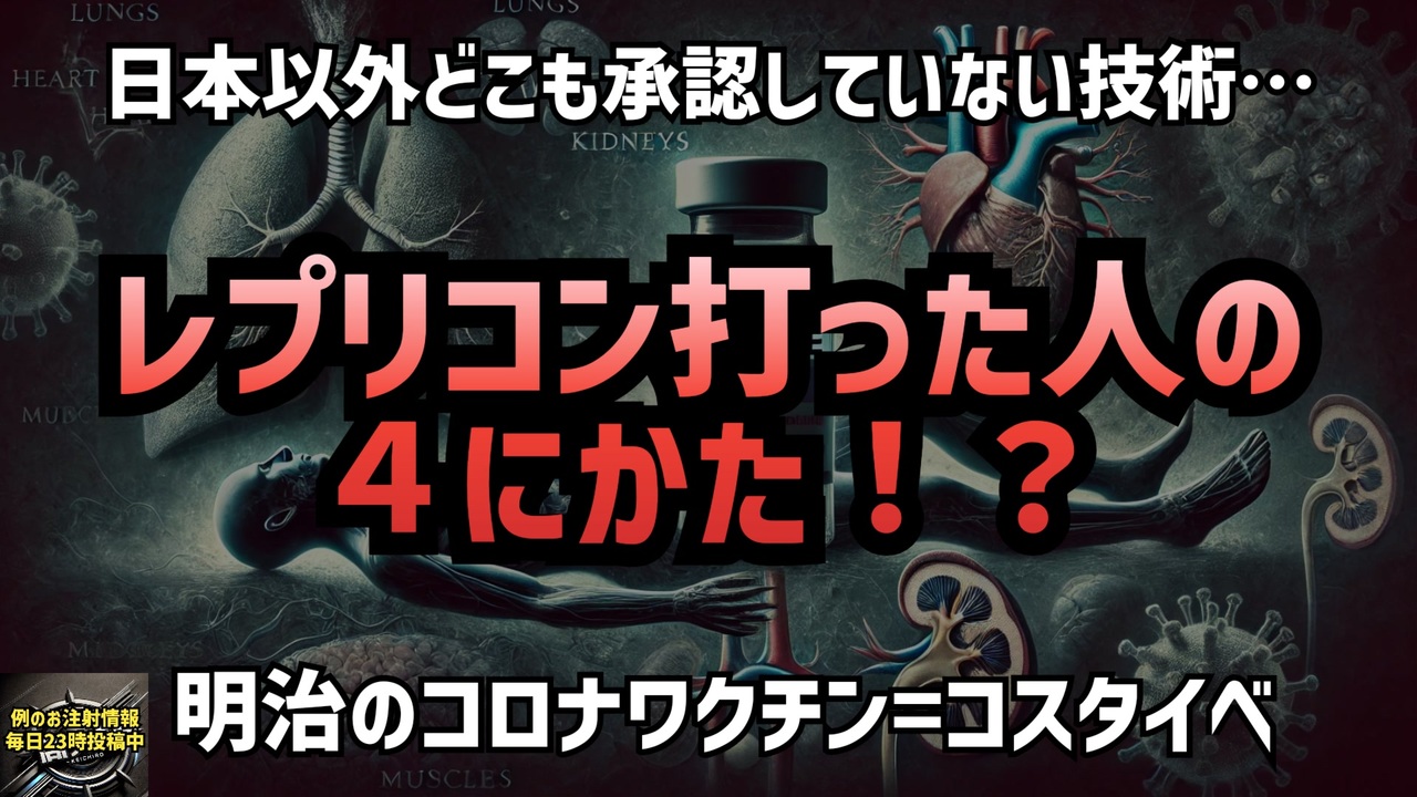 レプリコン打った人の死に方を解説。<br>こんな死に方したくない人は絶対打つな!<br>#シカ先生 <br><a href="https://t.co/IBG3OOKNMW" target="_blank" rel="noopener nofollow">https://t.co/IBG3OOKNMW</a><br><br>#レプリコン はスパイクをコードする遺伝子に加え,コピーするレプリカーゼ酵素をコードするウイルス遺伝子も含まれる.コピーでミスが出る<br><br>明治製菓ファルマの #コスタイベ(復讐)もレプリコンで,抗原スパイクは新型コロナウイルスでなくベネズエラウマ脳炎ウイルスのものだ。<br><br><a href="https://news.yahoo.co.jp/expert/articles/bab059645795621a2c0f4148e76b84b29f83045d" target="_blank" rel="noopener nofollow">https://news.yahoo.co.jp/expert/articles/bab059645795621a2c0f4148e76b84b29f83045d</a><br><br><a href="https://x.com/9pLv4/status/1843164670015996064?t=N7-JL3A7am3RsyuK0ak7pg&s=19" target="_blank" rel="noopener nofollow">https://x.com/9pLv4/status/1843164670015996064?t=N7-JL3A7am3RsyuK0ak7pg&s=19</a><br><br><br>レプリコンワクチン<br>ワクチン<br>鹿先生<br>自己免疫疾患<br>LNPアジュバント<br>心筋炎<br><br>間質性肺炎<br>腎不全<br>危険なワクチン<br>横紋筋融解症<br>ワクチンのリスク<br><br><br>「レプリコンワクチンの驚くべき副作用!死のリスクと病気の真実とは?」<br><br><br><br />著作権、肖像権に配慮して作成しております。<br><br>◆気になったニュースの台本!?<br>メモ代わりに作った台本をそのままあげてます<br><a href="https://keiichiro8140.hatenablog.com/." target="_blank" rel="noopener nofollow">https://keiichiro8140.hatenablog.com/.</a><br><br><br>ここからはシリーズ紹介<br><br><br>◆ ワクチン解毒・デトックス<br><a href="https://x.gd/fZweg" target="_blank" rel="noopener nofollow">https://x.gd/fZweg</a><br><br>◆ウイリアム・マキス博士のがん治療(イベルメクチン・フェンベンダゾール等)<br><a href="https://x.gd/AtFYS" target="_blank" rel="noopener nofollow">https://x.gd/AtFYS</a><br><br>◆予防接種健康被害救済制度<br><a href="https://x.gd/0xK9x" target="_blank" rel="noopener nofollow">https://x.gd/0xK9x</a><br><br>◆気になったニュース #1501~<br><br>◆ 【ショートver】気になったニュース<br><a href="https://x.gd/7MxXC" target="_blank" rel="noopener nofollow">https://x.gd/7MxXC</a><br><br>◆ 気になったニュース #1001~<br><a href="https://x.gd/Lp8gv" target="_blank" rel="noopener nofollow">https://x.gd/Lp8gv</a><br><br>◆ 気になったニュース #501~<br><a href="https://x.gd/EmbS4" target="_blank" rel="noopener nofollow">https://x.gd/EmbS4</a><br><br>◆ 気になったニュース #1~#500<br><a href="https://x.gd/uPhNb" target="_blank" rel="noopener nofollow">https://x.gd/uPhNb</a><br><br>◆ X(旧Twitter)・テレグラムで気になった情報<br><a href="https://x.gd/YG6FT" target="_blank" rel="noopener nofollow">https://x.gd/YG6FT</a><br><br>◆ 日比谷5万人パレードデ⚪生放送アーカイブ動画<br><a href="https://x.gd/3CHJv" target="_blank" rel="noopener nofollow">https://x.gd/3CHJv</a><br><br>◆日比谷5万人パレード⚪モのマイリスト作ってみました<br><a href="https://nico.ms/mylist/76828848?ref=sp_other" target="_blank" rel="noopener nofollow">https://nico.ms/mylist/76828848?ref=sp_other</a><br><br>◆3.30 令和の百姓⚪⚪<br><a href="https://www.nicovideo.jp/series/511791?ref=garage_share_other" target="_blank" rel="noopener nofollow">https://www.nicovideo.jp/series/511791?ref=garage_share_other</a><br><br>◆ 及川幸久さんの【XNEWS】シリーズ<br><a href="https://x.gd/3k78K" target="_blank" rel="noopener nofollow">https://x.gd/3k78K</a><br><br>◆これまでの動画<a href="https://x.gd/sPXoJ" target="_blank" rel="noopener nofollow">https://x.gd/sPXoJ</a><br><br>◆もしも(BAN)の時のためのマイリンク集<a href="https://lit.link/K-16_News44" target="_blank" rel="noopener nofollow">https://lit.link/K-16_News44</a><br><br>