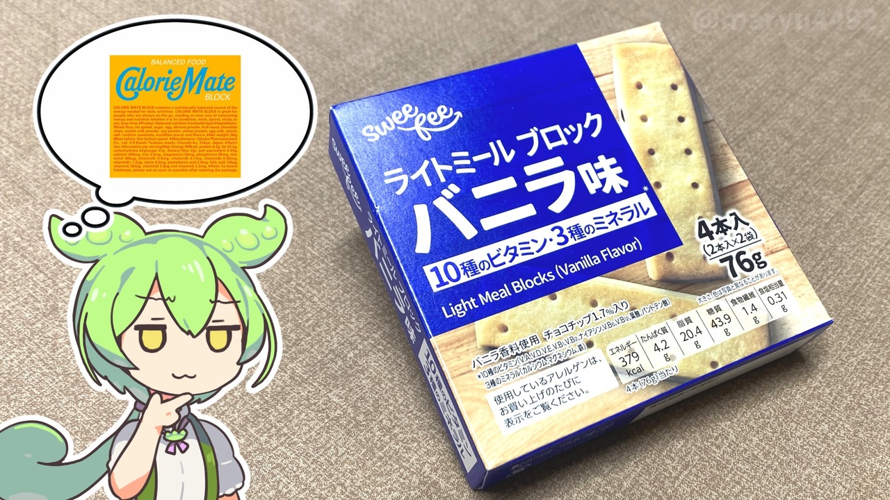 似ていますがライトミールブロックです。<br><br><br>【参考】 <br>スウィーフィー ライトミールブロック バニラ味(トップバリュ) <br><a href="https://www.topvalu.net/items/detail/4549414630374/" target="_blank" rel="noopener nofollow">https://www.topvalu.net/items/detail/4549414630374/</a> <br>ハマダコンフェクト株式会社<br> <a href="https://www.hamadaconfect.com/" target="_blank" rel="noopener nofollow">https://www.hamadaconfect.com/</a> <br>大事な水、どうやって備えますか?(農林水産省) <br><a href="https://www.maff.go.jp/j/zyukyu/foodstock/imadoki/imadoki02_10.html#" target="_blank" rel="noopener nofollow">https://www.maff.go.jp/j/zyukyu/foodstock/imadoki/imadoki02_10.html#</a> <br>製品情報 カロリーメイトブロックタイプ(大塚製薬)<br> <a href="https://www.otsuka.co.jp/cmt/product/block/" target="_blank" rel="noopener nofollow">https://www.otsuka.co.jp/cmt/product/block/</a> <br>カロリーメイト マメ知識(大塚製薬) <br><a href="https://www.otsuka.co.jp/virtual-factory-tour/caloriemate/trivia.html" target="_blank" rel="noopener nofollow">https://www.otsuka.co.jp/virtual-factory-tour/caloriemate/trivia.html</a><br><br>【使用した素材】(※敬称略) <br>(合成音声)VOICEVOX/ずんだもん/四国めたん<br> <a href="https://voicevox.hiroshiba.jp/" target="_blank" rel="noopener nofollow">https://voicevox.hiroshiba.jp/</a> <br>(立ち絵)坂本アヒル<br> <a href="https://seiga.nicovideo.jp/seiga/im10788496?track" target="_blank" rel="noopener nofollow">https://seiga.nicovideo.jp/seiga/im10788496?track</a> <br>(楽曲)甘茶の音楽工房/「楽しい麦畑」「フルーツパフェ」「お城の舞踏会」 <br><a href="https://amachamusic.chagasi.co" target="_blank" rel="noopener nofollow">https://amachamusic.chagasi.co</a>