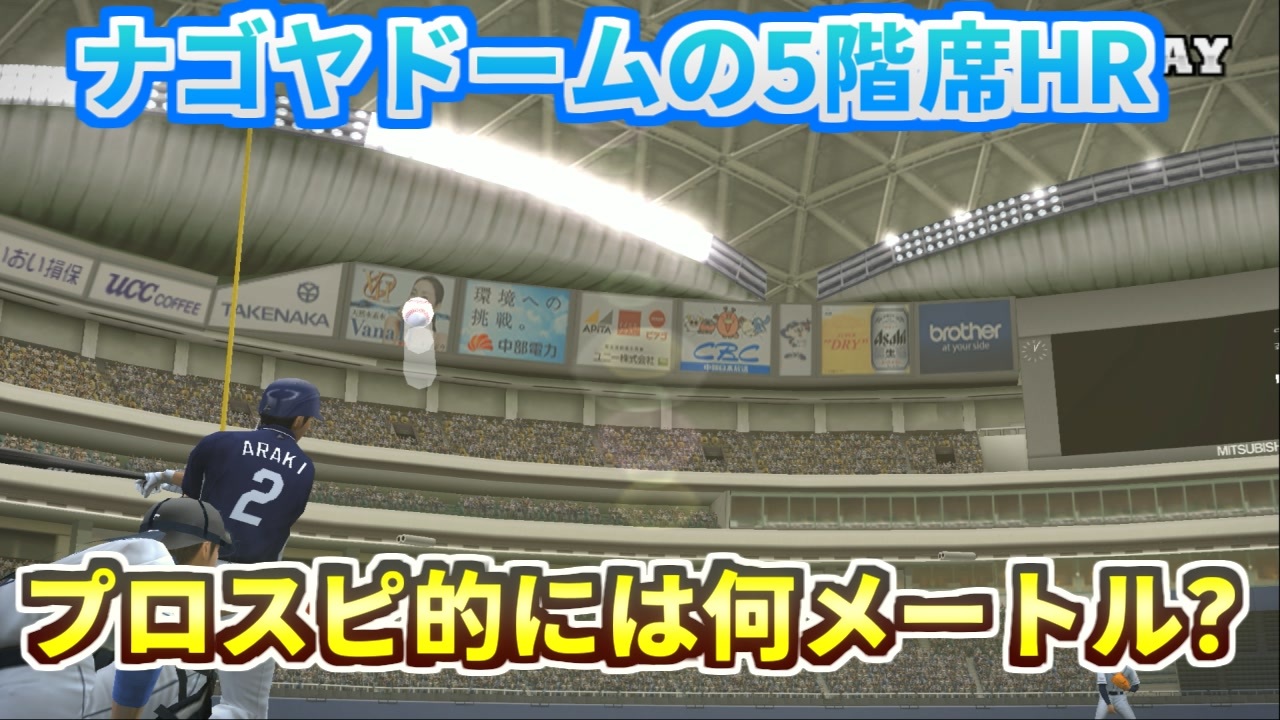 そういえばWRCの頃に大谷選手がナゴヤドームの5階席に放り込んだことがありました。<br>あの時は160メートル弾との公表でしたが、プロスピ的には何メートルくらいになるのか検証してみました。<br>結果としては150メートルくらいではないでしょうかね?<br>カブレラの180メートル弾の時もそうでしたが、少しサバを読んでいる気がします。<br />動画に「いいね!」「マイリスト登録」よろしくお願いします。<br><br>・おすすめ<br>[TAS]Grand Theft Auto 3 Part1→<a href="https://www.nicovideo.jp/watch/sm14718961" class="watch">sm14718961</a><br>[TAS]MaxPayne デッドターゲット Part1→<a href="https://www.nicovideo.jp/watch/sm15093299" class="watch">sm15093299</a><br>[TAS]michigan Part1→<a href="https://www.nicovideo.jp/watch/sm18393230" class="watch">sm18393230</a><br><br>サポート頂けると励みになります<br>魔界塔士のサポーターになる→<a href="https://creator-support.nicovideo.jp/registration/15153622" target="_blank" rel="noopener nofollow">https://creator-support.nicovideo.jp/registration/15153622</a><br><br>TAS動画まとめ→<a href="https://koeiprogenitor.com/tas/matome/" target="_blank" rel="noopener nofollow">https://koeiprogenitor.com/tas/matome/</a><br>つべ→<a href="https://www.youtube.com/user/koeiprogenitor1/" target="_blank" rel="noopener nofollow">https://www.youtube.com/user/koeiprogenitor1/</a><br>インスタ→<a href="https://www.instagram.com/makaitoshi" target="_blank" rel="noopener nofollow">https://www.instagram.com/makaitoshi</a><br><br>本編→シリーズ一覧見てね<br>