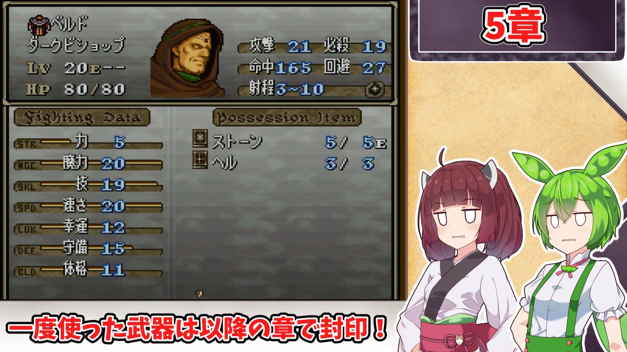 <span style="color: #85200c; font-size: 24px;"><strong><i>長らくお待たせしてしまい申し訳ないです…<br>次回からは再び週1投稿を目指します</i></strong></span><br><br><br><span style="font-size: 16px;"><strong>1:一度使用した武器種は、以降の章で使用する事を禁止する。<br>2:武器の使用の定義は『その武器を装備した状態で敵との戦闘が発生したタイミング』<br>または『その武器を使って敵に「捕える」コマンドを実行したタイミング』<br>杖の場合は『対象に対して使用した時点(命中の可否は問わない)』とする。 </strong></span><br><span style="color: #ff0000; font-size: 16px;"><strong>※同盟軍、演出による戦闘イベントでは使用した判定にはならないこととする。</strong></span><span style="font-size: 16px;"><strong> <br>3:仲間を47人生存させ、【外伝】を含む全ての章を攻略し、総合評価でB以上の状態でゲームをクリアする。</strong></span><br><br><br>本動画のシリーズリスト【<a href="https://www.nicovideo.jp/series/482976" target="_blank" rel="noopener">series/482976</a>】<br>『烈火』の同縛りプレイ【<a href="https://www.nicovideo.jp/series/406473" target="_blank" rel="noopener">series/406473</a>】<br>『封印』の同縛りプレイ【<a href="https://www.nicovideo.jp/series/316824" target="_blank" rel="noopener">series/316824</a>】<br>前:【<a href="https://www.nicovideo.jp/watch/sm44124600" class="watch">sm44124600</a>】次:【<a href="https://www.nicovideo.jp/watch/sm44228969" class="watch">sm44228969</a>】<br><br><strong>使用したソフト</strong><br>VOICEROID+東北きりたんEX<br>VOICEVOX:ずんだもん<br>VOICEPEAK ずんだもん<br><strong>お借りした素材</strong><br>ニコニコモンズの皆様(コンテンツツリー参照)