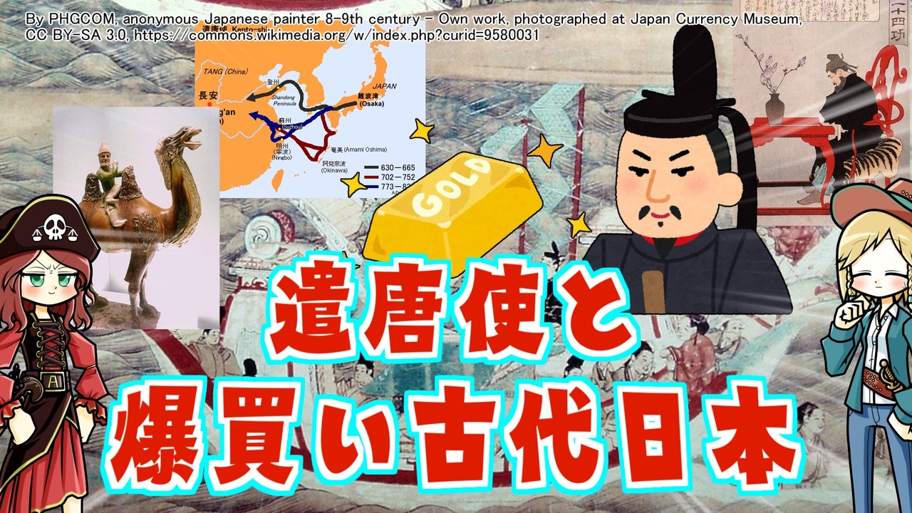 鳴くよウグイス遣唐使! というわけで名前だけはみんな知ってる遣唐使ですが、なんか中国への文化交流使節みたいな奴って印象が強いのではないでしょうか。 <br><br>それも間違いではないですが、ひとつの行為にはいろんな目的があるもの。そのサブ的な任務とそれにまつわるお話です。いつもながら地味すぎるだろ。 <br><br>☆復活したニコニコチャンネル「モンド・ヒストリカの離宮」 <br>→<a href="https://ch.nicovideo.jp/mond-historica" target="_blank" rel="noopener nofollow">https://ch.nicovideo.jp/mond-historica</a><br><br> 参考文献:<br> 山崎覚士(2023)『東アジア海域のなかの日本』東方書店<br>河上麻由子(2019)『古代日中関係史』中央公論新社<br>石井正敏(2003)『東アジア世界と古代の日本』山川出版社<br>荒川正晴(2003)『オアシス国家とキャラヴァン交易』山川出版社<br>平田陽一郎(2023)『隋━「流星王朝」の光芒』中央公論新社<br>森部豊(2023)『唐━東ユーラシアの大帝国』中央公論新社<br>杉山正明(2014)『大モンゴルの世界 陸と海の巨大帝国』KADOKAWA<br>宮崎正勝(1997)『鄭和の南海大遠征』中央公論新社 <br><br>その他 Wikipediaなど twitter | <a href="https://twitter.com/Yukkuri_mond" target="_blank" rel="noopener nofollow">https://twitter.com/Yukkuri_mond</a><br />━━━━━━━━━━━━━━━━━━━━━<br><br>この動画はクリエイティブ・コモンズ継承(CC-BY-SA)ライセンスの素材を使用して制作しています。(<a href="https://creativecommons.org/licenses/by-sa/4.0/)" target="_blank" rel="noopener nofollow">https://creativecommons.org/licenses/by-sa/4.0/)</a><br>規約に基づき、この動画もCC-BY-SA 4.0 のもとで公開します。<br><br>投稿者共通情報☆彡<br><br>BGM, SE:ニコニ・コモンズ様<br><a href="http://commons.nicovideo.jp/" target="_blank" rel="noopener nofollow">http://commons.nicovideo.jp/</a><br>魔王魂様<br><a href="https://maoudamashii.jokersounds.com/" target="_blank" rel="noopener nofollow">https://maoudamashii.jokersounds.com/</a><br>Audiostock様<br><a href="https://audiostock.jp/" target="_blank" rel="noopener nofollow">https://audiostock.jp/</a><br><br>立ち絵 霊夢・魔理沙(黒子式):nicotalk様<br><a href="http://www.nicotalk.com/charasozai.html" target="_blank" rel="noopener nofollow">http://www.nicotalk.com/charasozai.html</a><br><br>立ち絵 パトラ、マリー、アン、メアリ:ライフライフ様<br><a href="https://0801lifelife.tumblr.com/" target="_blank" rel="noopener nofollow">https://0801lifelife.tumblr.com/</a><br><br>使用ツール1:ゆっくりムービーメーカー4<br><a href="https://manjubox.net/ymm4/" target="_blank" rel="noopener nofollow">https://manjubox.net/ymm4/</a><br><br>使用ツール2:AviUtl<br><a href="http://spring-fragrance.mints.ne.jp/aviutl/" target="_blank" rel="noopener nofollow">http://spring-fragrance.mints.ne.jp/aviutl/</a><br><br>各時代の地図 : World History Maps & Timelines <br><a href="http://geacron.com/home-en/" target="_blank" rel="noopener nofollow">http://geacron.com/home-en/</a><br><br>ゆっくりボイスについて:AquesTalkライセンス取得済み<br><br>キャラクターボイス<br>アン・ボニー:羽ノ華(A.I.VOICE)<br>メアリ・リード:琴葉 葵(A.I.VOICE)<br>クレオパトラ:結月ゆかり(VOICEROID2)<br>マリー‐アントワネット:東北きりたん (VOICEROID EX)<br>その他キャラ:青山龍星(A.I.VOICE)、伊織弓鶴(A.I.VOICE2)、栗田まろん(A.I.VOICE)、宮舞モカ(VOICEPEAK)、フリモメン(VOICEPEAK)<br><br><br><br>その他フリー素材ご提供元の皆様に圧倒的感謝<br>