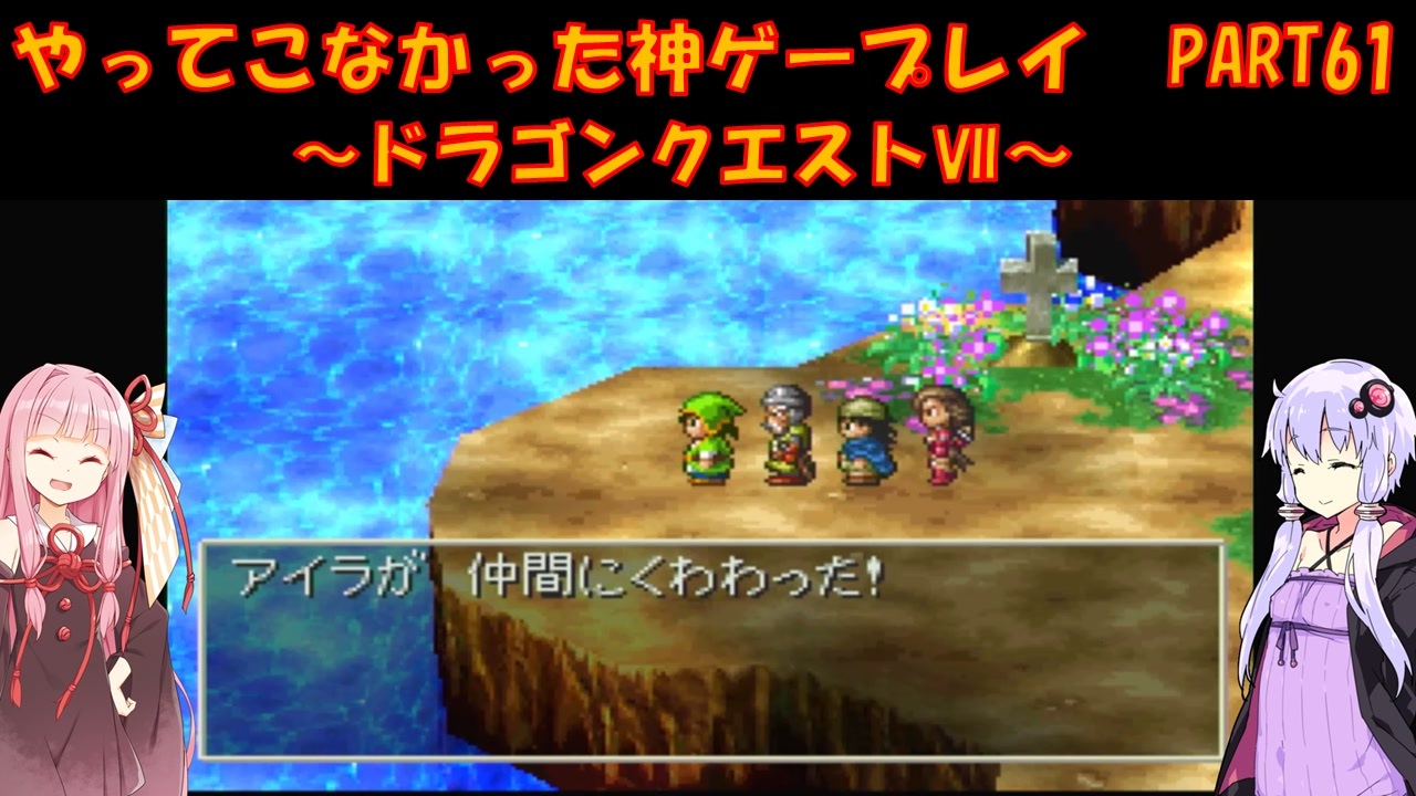 PS版 ドラゴンクエストⅦをプレイ<br>ゆかりさんはメジャーじゃないゲームをやる俺カッケー族だったのでドラクエをやったことがありませんでした(DSのⅤ以外)<br><br>茜:マリベルがいなくなって不安だったんよ<br>ゆ:すぐ仲間が増えて助かる<br><br>PART1:<a href="https://www.nicovideo.jp/watch/sm43851863" target="_blank" rel="noopener nofollow">https://www.nicovideo.jp/watch/sm43851863</a><br><br>各DQシリーズ第1回リンク<br>DQ1 PART1:<a href="https://www.nicovideo.jp/watch/sm41819145" target="_blank" rel="noopener nofollow">https://www.nicovideo.jp/watch/sm41819145</a><br>DQ2 PART1:<a href="https://www.nicovideo.jp/watch/sm41895278" target="_blank" rel="noopener nofollow">https://www.nicovideo.jp/watch/sm41895278</a><br>DQ3 PART1:<a href="https://www.nicovideo.jp/watch/sm42034398" target="_blank" rel="noopener nofollow">https://www.nicovideo.jp/watch/sm42034398</a><br>DQ4 PART1:<a href="https://www.nicovideo.jp/watch/sm42520974" target="_blank" rel="noopener nofollow">https://www.nicovideo.jp/watch/sm42520974</a><br>DQ5 PART1:<a href="https://www.nicovideo.jp/watch/sm42848575" target="_blank" rel="noopener nofollow">https://www.nicovideo.jp/watch/sm42848575</a><br>DQ6 PART1:<a href="https://www.nicovideo.jp/watch/sm43080264" target="_blank" rel="noopener nofollow">https://www.nicovideo.jp/watch/sm43080264</a><br>DQM1 PART1:<a href="https://www.nicovideo.jp/watch/sm43525709" target="_blank" rel="noopener nofollow">https://www.nicovideo.jp/watch/sm43525709</a><br><br>動画内で使用させていただいた素材<br>【イラスト】<br>結月ゆかり→ペテン師様:<a href="https://seiga.nicovideo.jp/seiga/im5494168" target="_blank" rel="noopener nofollow">https://seiga.nicovideo.jp/seiga/im5494168</a><br>琴葉茜→ユメのオワリ様:<a href="https://seiga.nicovideo.jp/seiga/im10706241" target="_blank" rel="noopener nofollow">https://seiga.nicovideo.jp/seiga/im10706241</a><br><br>【音声】<br>A.I.Voice:琴葉茜<br><a href="https://aivoice.jp/product/kotonoha/" target="_blank" rel="noopener nofollow">https://aivoice.jp/product/kotonoha/</a><br><br>A.I.Voice:結月ゆかり<br><a href="https://aivoice.jp/product/yukari/" target="_blank" rel="noopener nofollow">https://aivoice.jp/product/yukari/</a><br><br>【その他素材】<br>効果音ラボ様:<a href="https://soundeffect-lab.info/" target="_blank" rel="noopener nofollow">https://soundeffect-lab.info/</a><br>いらすとや様:<a href="https://www.irasutoya.com/" target="_blank" rel="noopener nofollow">https://www.irasutoya.com/</a><br>等<br><br>この動画で利用している株式会社スクウェア・エニックスを代表とする共同著作者が権利を所有する著作物及びスギヤマ工房有限会社が権利を所有する楽曲の転載・配布は禁止いたします。<br>© 2000 ARMOR PROJECT/BIRD STUDIO/HEART BEAT/ARTEPIAZZA/SQUARE ENIX All Rights Reserved.<br>© SUGIYAMA KOBO