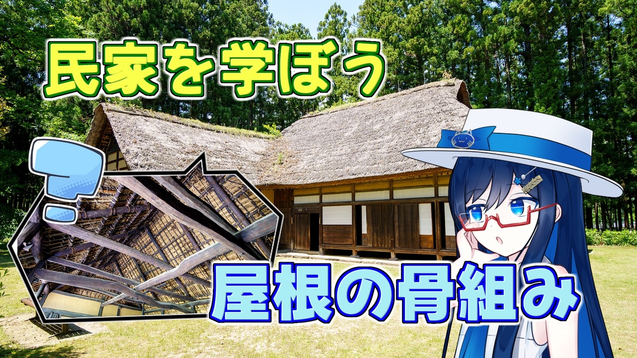 久しぶりの投稿は、新シリーズです。<br>民家に関する基礎知識をお話する『双葉湊音のイエガタリ』。<br>記念すべき一回目は屋根を形作る骨組み(小屋組)についてお話します。<br>小屋組にはどんな種類があるの?分布やどういう特徴があるの?といったことを、<br>ばみさんが教えてくれます。<br><br>目次<br><a href="#" class="seekTime" data-seekTime="0:00" onclick="seekNicoPlayer('#0:00'); return false;">#0:00</a> オープニング<br><a href="#" class="seekTime" data-seekTime="0:52" onclick="seekNicoPlayer('#0:52'); return false;">#0:52</a> 小屋組について<br><a href="#" class="seekTime" data-seekTime="1:26" onclick="seekNicoPlayer('#1:26'); return false;">#1:26</a> サス組について<br><a href="#" class="seekTime" data-seekTime="6:16" onclick="seekNicoPlayer('#6:16'); return false;">#6:16</a> オダチ組について<br><a href="#" class="seekTime" data-seekTime="11:12" onclick="seekNicoPlayer('#11:12'); return false;">#11:12</a> 和小屋組について<br><a href="#" class="seekTime" data-seekTime="13:10" onclick="seekNicoPlayer('#13:10'); return false;">#13:10</a> 洋小屋組について<br><a href="#" class="seekTime" data-seekTime="16:15" onclick="seekNicoPlayer('#16:15'); return false;">#16:15</a> エンディング<br><br>全国の町並みについて、実際に現地を訪れながら深掘りしていく建築解説動画『琴葉姉妹の町並み巡検録』シリーズもどうぞよろしくお願いいたします。<br>→ <a href="https://www.nicovideo.jp/series/360315" target="_blank" rel="noopener">series/360315</a><br><br>古き良き旅館・ホテルを探訪する、『きりたんの宿帳』シリーズもどうぞよろしくお願いします。<br>→ <a href="https://www.nicovideo.jp/series/370374" target="_blank" rel="noopener">series/370374</a><br><br>Twitter : <a href="https://twitter.com/kunio_miracle" target="_blank" rel="noopener nofollow">https://twitter.com/kunio_miracle</a><br>