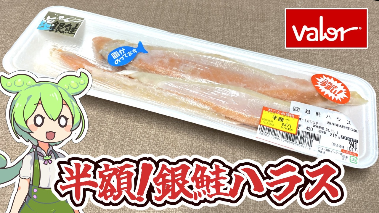 バローに食材を買いに行ったら銀鮭ハラスが安くなっていたので買ってみました。<br><br><br><br> 【参考】<br> スーパーマーケット バロー<br> <a href="https://valor.jp/" target="_blank" rel="noopener nofollow">https://valor.jp/</a><br> ハラスとは?特徴や鮭ハラスについてご紹介 2021.07.24(DELISH KITCHEN) <br><a href="https://delishkitchen.tv/articles/800" target="_blank" rel="noopener nofollow">https://delishkitchen.tv/articles/800</a> <br>サケは赤身の魚ですか、白身の魚ですか。(農林水産省) <br><a href="https://www.maff.go.jp/j/heya/sodan/1203/03.html#" target="_blank" rel="noopener nofollow">https://www.maff.go.jp/j/heya/sodan/1203/03.html#</a><br><br>【使用した素材】(※敬称略) <br>(合成音声)VOICEVOX/ずんだもん/四国めたん <br><a href="https://voicevox.hiroshiba.jp/" target="_blank" rel="noopener nofollow">https://voicevox.hiroshiba.jp/</a> <br>(立ち絵)坂本アヒル<br> <a href="https://seiga.nicovideo.jp/seiga/im10788496?track" target="_blank" rel="noopener nofollow">https://seiga.nicovideo.jp/seiga/im10788496?track</a> <br>(イラスト)かわいいフリー素材集 いらすとや<br><a href="https://www.irasutoya.com/" target="_blank" rel="noopener nofollow">https://www.irasutoya.com/</a><br>(楽曲)甘茶の音楽工房/「楽しい麦畑」「フルーツパフェ」「お城の舞踏会」 <br><a href="https://amachamusic.chagasi.co" target="_blank" rel="noopener nofollow">https://amachamusic.chagasi.co</a><br>