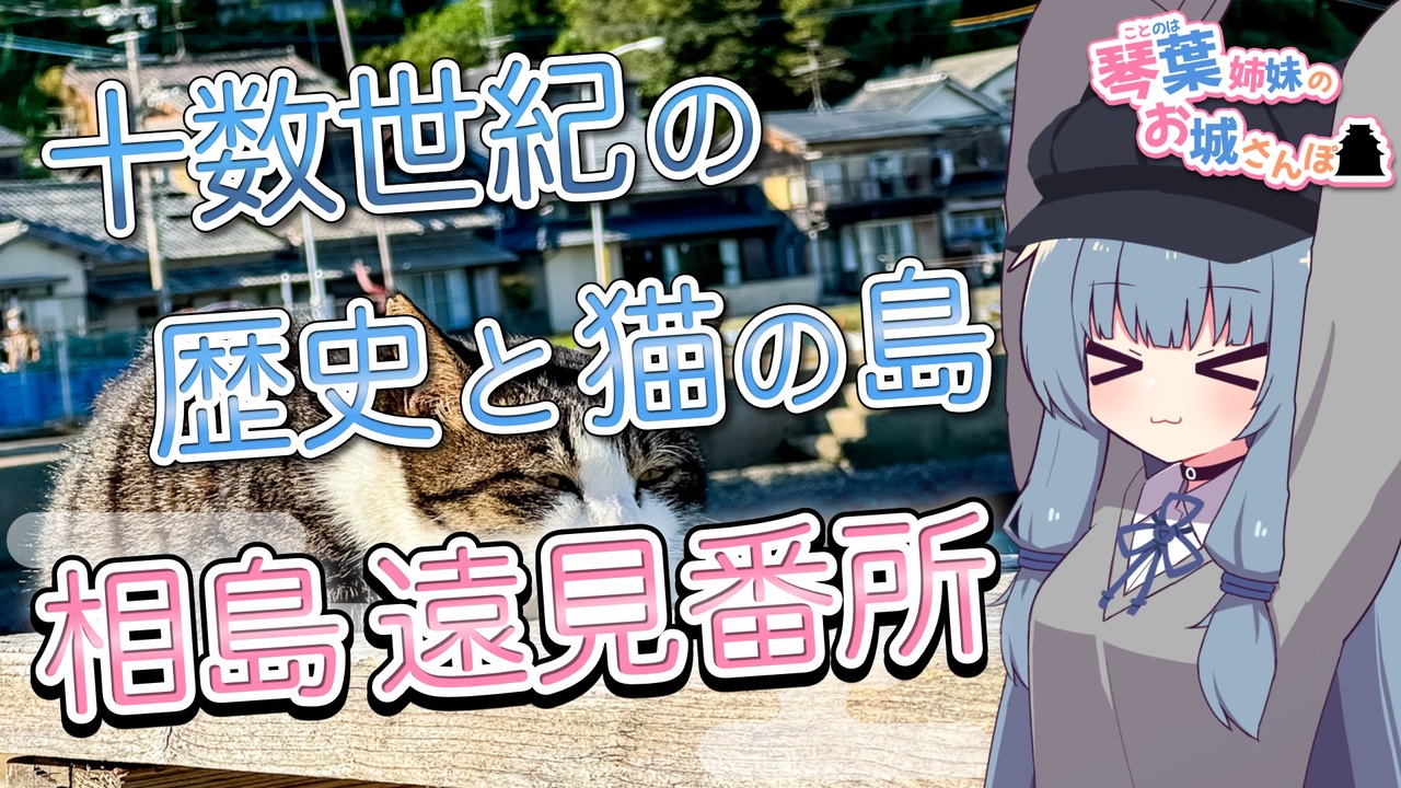 琴葉姉妹が福岡にある猫の島「相島」(あいのしま)へお散歩へ!<br>ついでに難しい話はほどほどに、遠見番所をはじめとする島の歴史的遺構巡り!<br><br>猫と<span style="font-size: 18px;"><strong>石垣</strong></span>に癒されてきた!!!<br><br>【紹介スポット】<br>◆福岡県 新宮町 相島<br>・筑前相島灯台<br>・(相島)遠見番所<br>・太閤潮井の石<br>・相島積石塚群 (120号墳)<br>・めがね岩<br><br>≪視聴の際の注意≫<br>※<span style="color: #e06666;"><strong>歴史< 景色</strong></span><span style="color: #e06666;"> </span>なので難しい歴史とか詳細な解説要素は少なめです。ご了承下さい<br>※諸説ある歴史は諸説楽しみましょう<br>※以下の要素を含みます<br> ・グダグダな掛け合い<br> <s>・茜ちゃん弁</s><br /><br><span style="color: #cc4125; font-size: 24px;"><strong>城郭登城祭第三陣やるよ~! みんなお城行こうね!</strong></span><br>詳しくは下記の告知動画を観てね!<br>◆開催期間:<br>2026年4月4日(土) 0:00 ~ 4月12日(日) 23:59<br><br>◆告知動画:<br><a href="https://www.nicovideo.jp/watch/sm45392440" class="watch">sm45392440</a><br><br>《城郭登城祭第二陣(2025)の参加動画》<br><a href="https://www.nicovideo.jp/mylist/77145802" target="_blank" rel="noopener">mylist/77145802</a><br><br>《琴葉姉妹のお城さんぽ》<br><a href="https://www.nicovideo.jp/series/332352" target="_blank" rel="noopener">series/332352</a><br><br>《お城の初心者解説動画のような何か》<br><a href="https://www.nicovideo.jp/series/485578" target="_blank" rel="noopener">series/485578</a><br><br>いつもコメントやいいね、広告等で応援いただきありがとうございます!物凄く励みになってます!<br>良ければ気軽にフォローとか反応頂けたら嬉しみです~( ˘ω˘)<br><br>中の人のあれこれ(lit link)→ <a href="https://lit.link/yunominochashibu" target="_blank" rel="noopener nofollow">https://lit.link/yunominochashibu</a>
