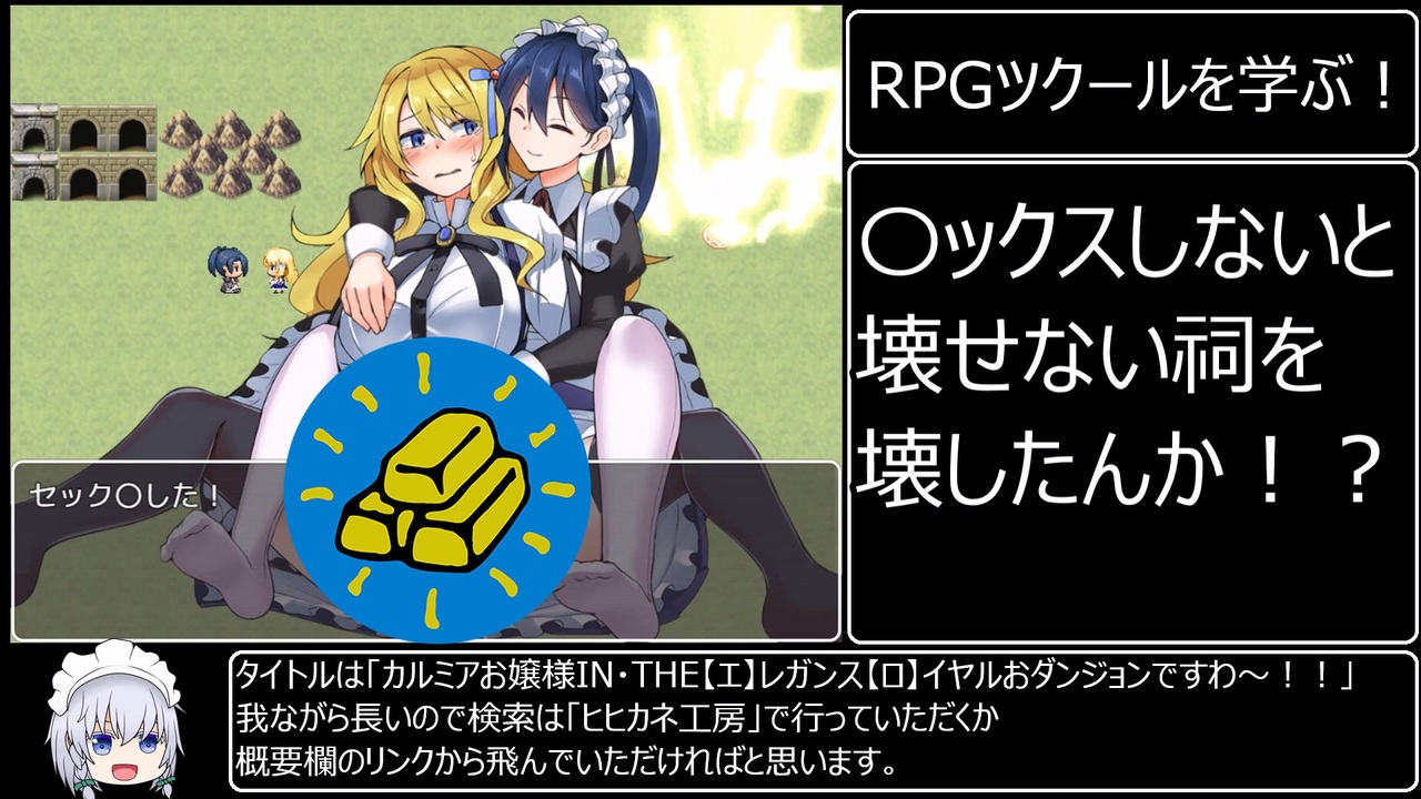 ニコニコ動画講座の初投稿です <br><br><span style="font-size: 16px;"><strong>【セ。ク〇しないと壊せない祠を壊したんか!?】</strong></span><br><br>を通じてRPGツクールを学ぼう! <br><br><span style="font-size: 16px;"><strong>エ□ゲRTAパート1と単発のマイリスト→<a href="https://www.nicovideo.jp/mylist/70659794" target="_blank" rel="noopener">mylist/70659794</a> <br><br>ゲーム制作記パート1→ <a href="https://www.nicovideo.jp/watch/sm43632987" class="watch">sm43632987</a> </strong></span><br><br>スマホやタブレット等から見られない方はこちらの動画を参考にすると 見られるようになるはずです→ <a href="https://www.nicovideo.jp/watch/sm38575952" class="watch">sm38575952</a> <br><br><span style="font-size: 16px;"><strong>体験版をDL&金塊隠し無しのPVがある予告ページはこちら!<br>是非お気に入り登録とかをお願いします! <br>【ヒヒカネ工房】 <br>カルミアお嬢様IN・THE[エ]レガンス[ロ]イヤルおダンジョンですわ~!! <br><br><a href="https://www.dlsite.com/maniax/announce/=/product_id/RJ01236961.html" target="_blank" rel="noopener nofollow">https://www.dlsite.com/maniax/announce/=/product_id/RJ01236961.html</a> <br><br>私ヒヒダウザーこと【ヒヒカネ工房】の <br>Cien: <a href="https://ci-en.dlsite.com/creator/21024" target="_blank" rel="noopener nofollow">https://ci-en.dlsite.com/creator/21024</a> <br>X(twitter): <a href="https://twitter.com/hihidowser" target="_blank" rel="noopener nofollow">https://twitter.com/hihidowser</a> <br>misskey: <a href="https://misskey.io/@hihidowser" target="_blank" rel="noopener nofollow">https://misskey.io/@hihidowser</a></strong></span>